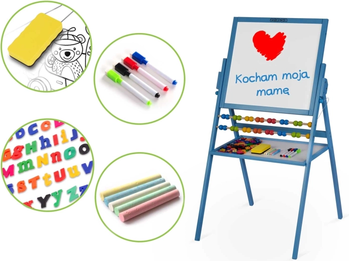 Tabla dublă, rotativă, pentru copii oferă două suprafețe creative: una cu cretă pentru desen liber și una albă magnetică pentru scriere cu marker lavabil și lucru cu magneți. Cadrul stabil din lemn natural și suprafața practică de depozitare asigură o utilizare comodă și sigură acasă sau la grădiniță.