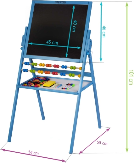 Construcția rotativă reunește o tablă pentru cretă, ideală pentru desen creativ, și o tablă albă magnetică pentru scriere cu markere lavabile și lucru cu litere și cifre magnetice.
