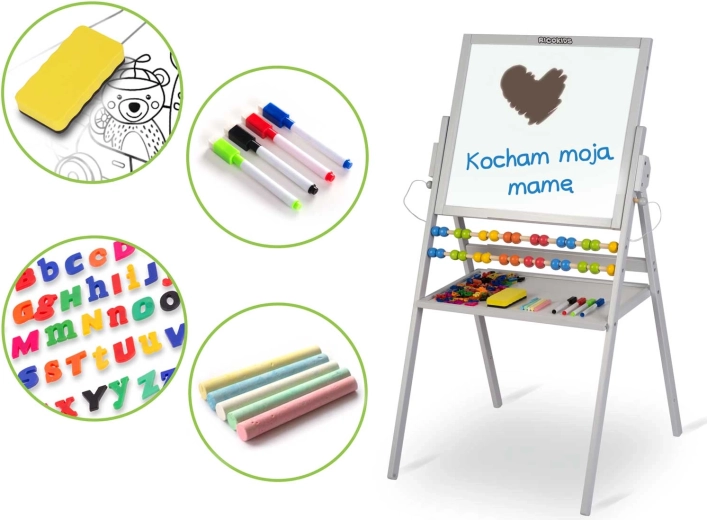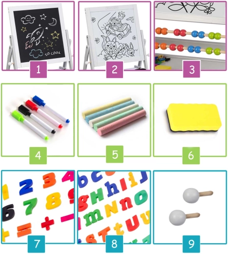 Datorită accesoriilor bogate, copiii încep imediat să creeze: cretă colorată, markere lavabile, burete, litere și cifre magnetice, precum și elemente de montaj. Materialele sigure și construcția stabilă din lemn natural oferă liniște părinților și bucurie copiilor.