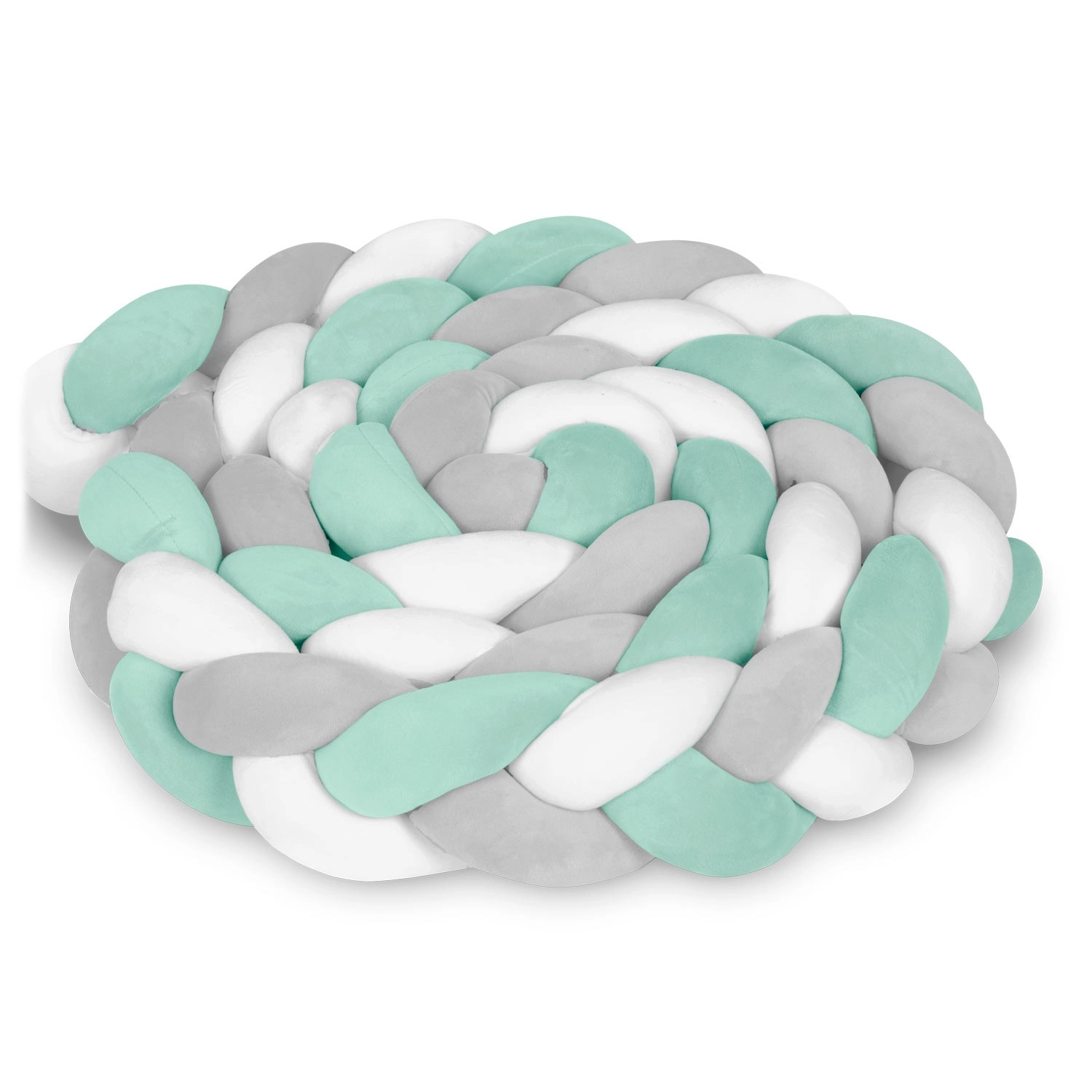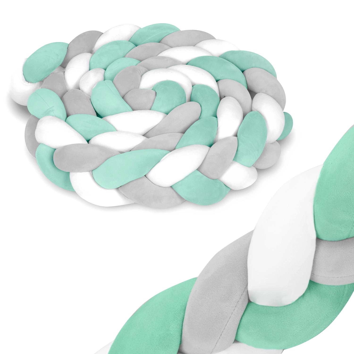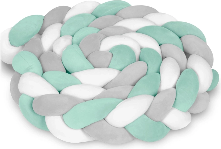 Apărătoarea împletită pentru pătuț, în combinația modernă mentă–gri, creează o barieră moale și sigură de-a lungul marginilor pătuțului. Datorită materialului plăcut, hipoalergenic, fără elemente ascuțite, este delicată cu pielea copilului și potrivită încă de la nou-născut. Matlasarea deasă și umplutura pufoasă atenuează loviturile și umplu spațiile dintre grilaje.