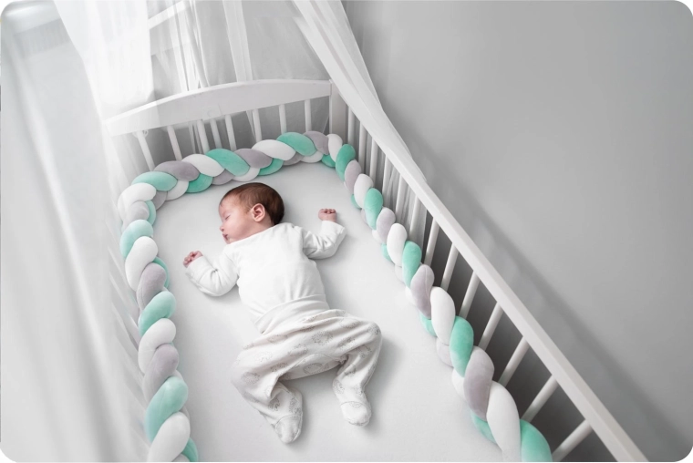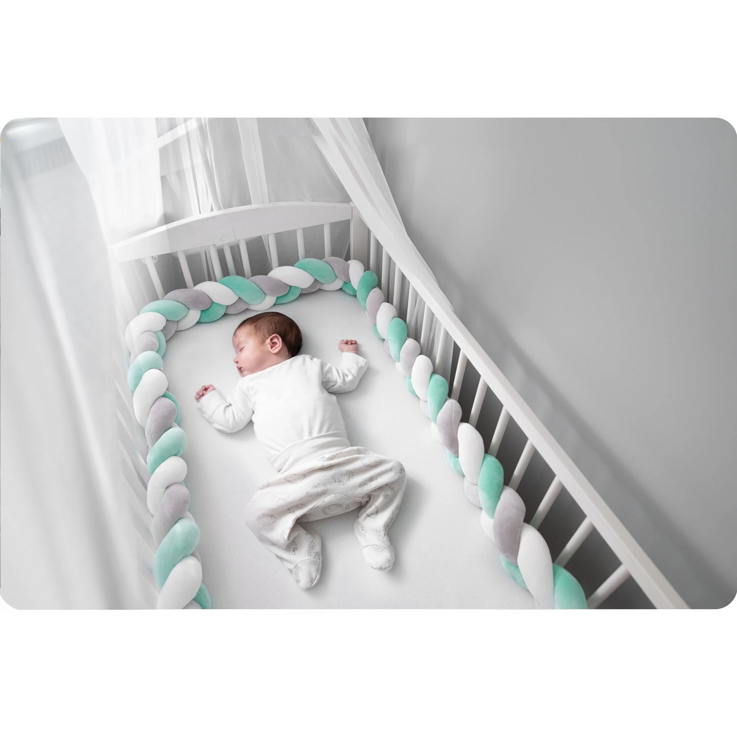 Materialul moale, antialergic, fără piese ascuțite, protejează bebelușul împotriva loviturilor de grilaje și creează un mediu liniștit și confortabil în pătuț.