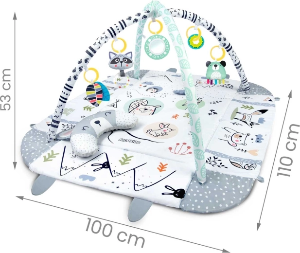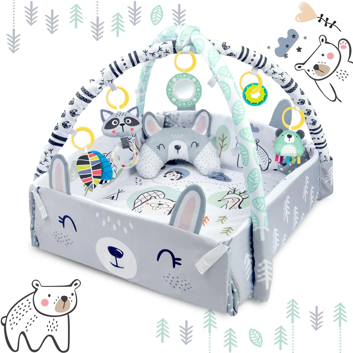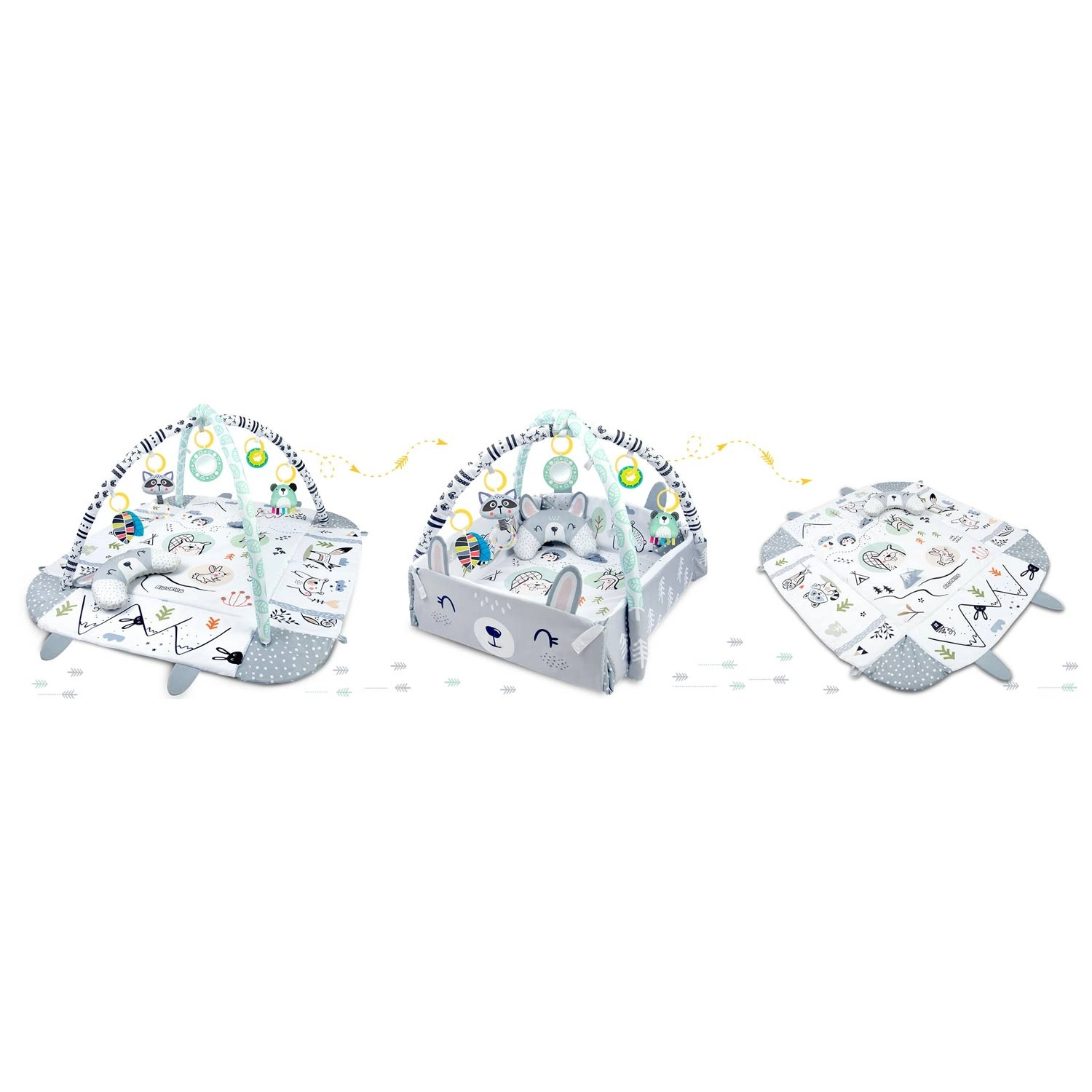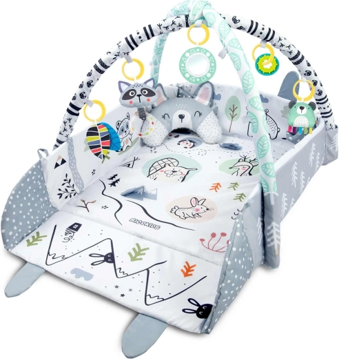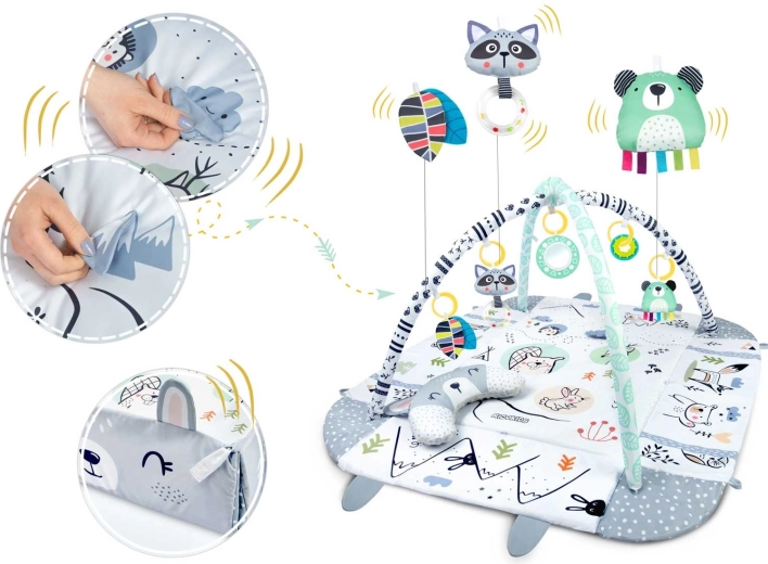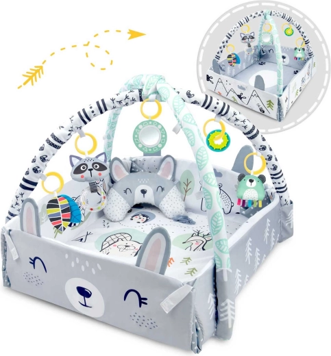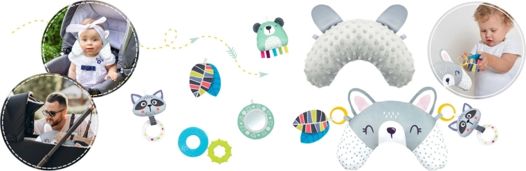 Include 7 jucării originale, printre care oglindă, zornăitoare, elemente foșnitoare și o jucărie piuitoare cu benzi senzoriale. Jucăriile și arcurile capitonate pot fi simplu repoziționate sau îndepărtate. Pernița pentru tummy time cu față minky catifelată susține poziționarea corectă și întărirea mușchilor gâtului și spatelui.
