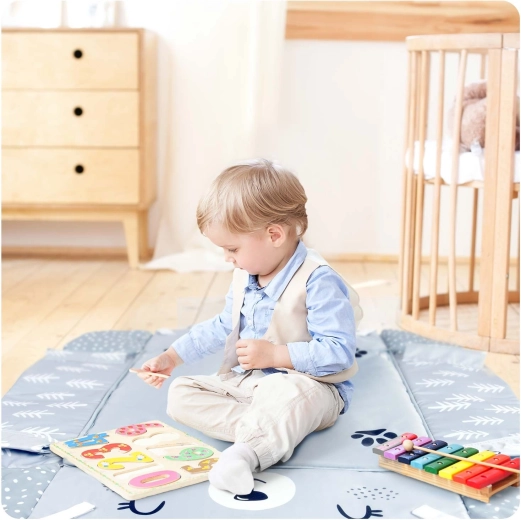 Detalii practice precum benzi velcro, prinderi intuitive și materialul rezistent, ușor de curățat, simplifică utilizarea zilnică. Dimensiunea generoasă de 110 × 100 cm oferă libertate de mișcare, iar ulterior covorașul poate servi ca mocheta copilului. Produsul respectă standardele EN 71 și poartă marcajul CE.