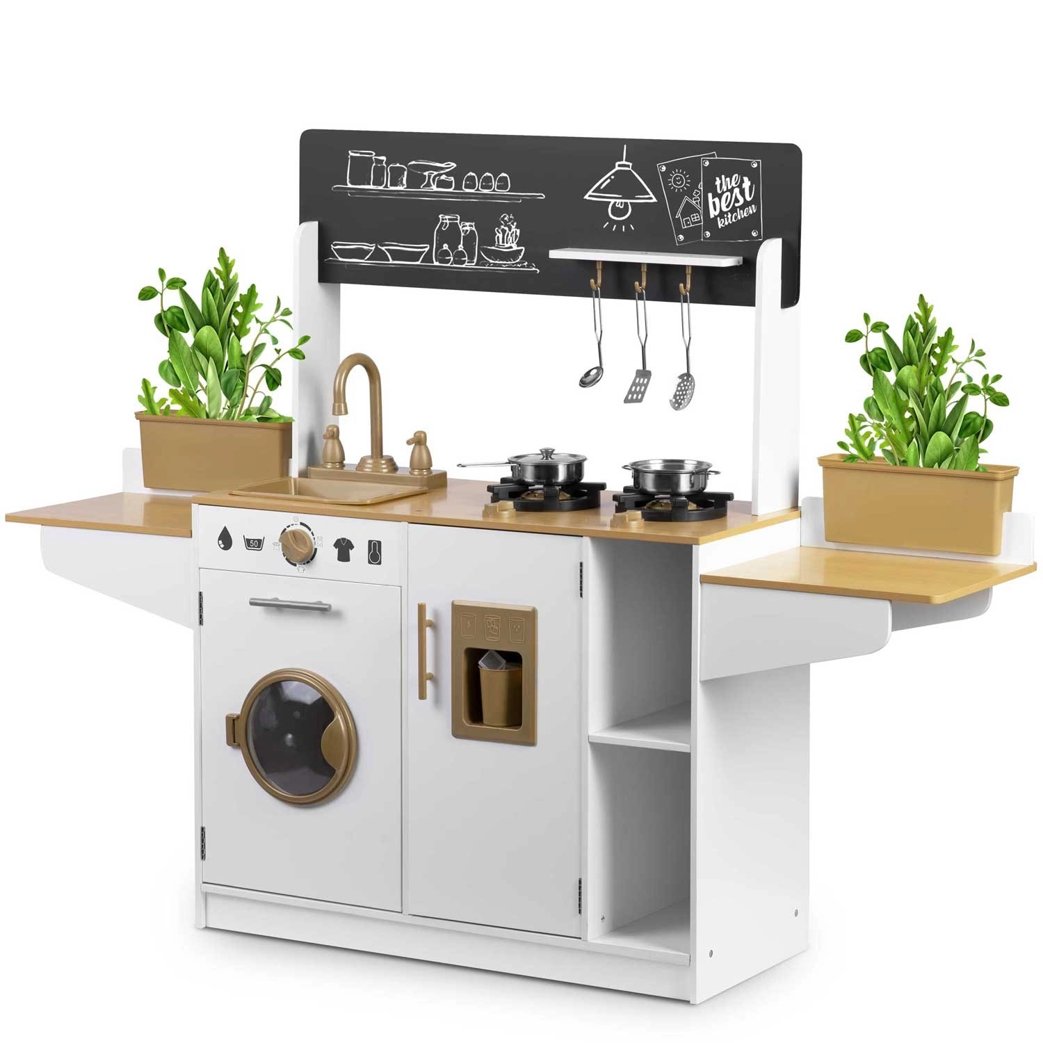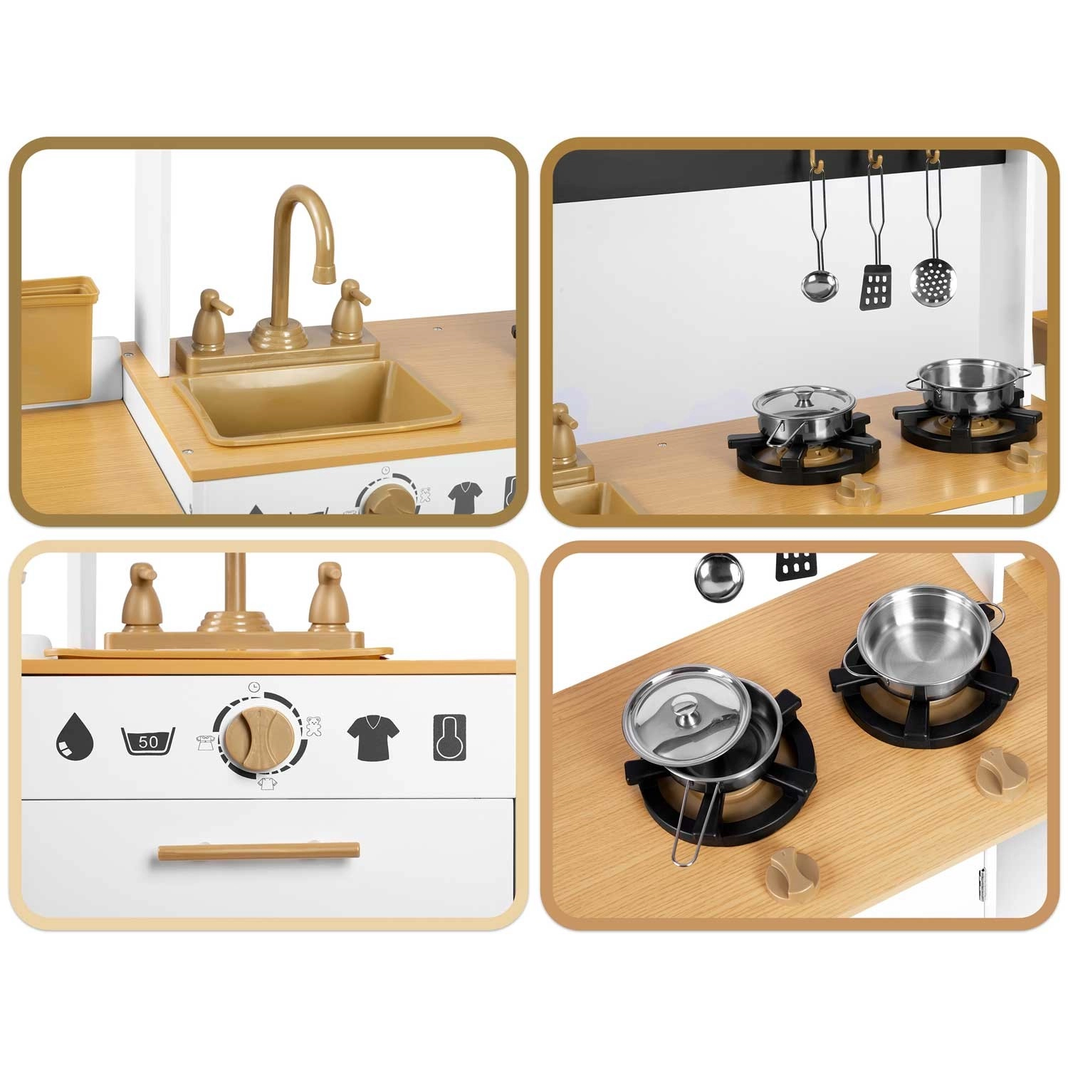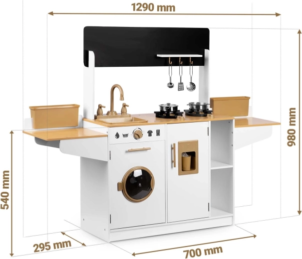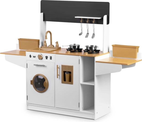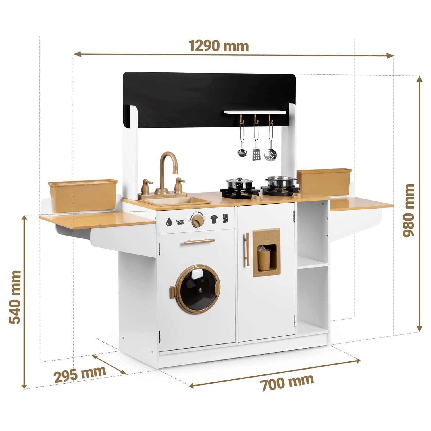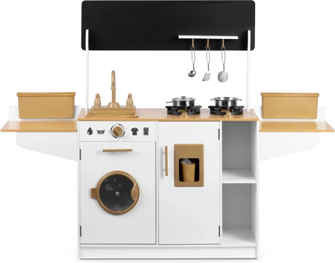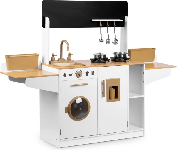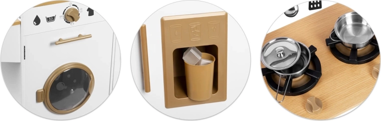 Bucătăria din lemn pentru copii RICOKIDS aduce detalii realiste care îi vor încânta pe micii bucătari: butoane funcționale, chiuvetă cu robinete, uși care se deschid și „electrocasnice” precum mașina de spălat sau frigiderul cu dozator de gheață. Pachetul include, de asemenea, un set de vase metalice și ustensile de bucătărie suspendate.