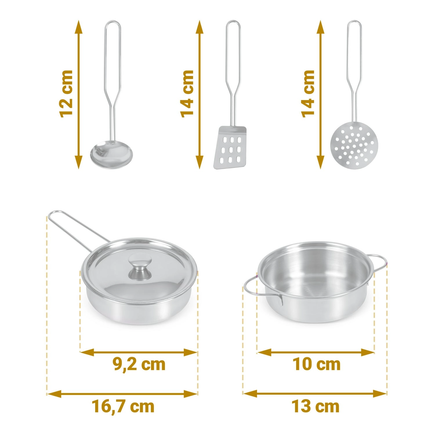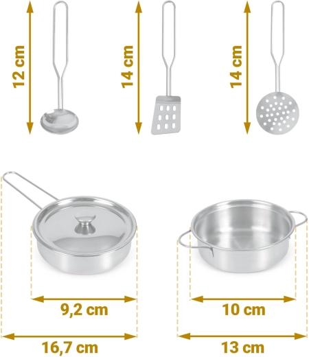 Două plite cu sunet la rotirea butoanelor, cârlige pentru ustensile și oale metalice stimulează imaginația și apropie copiii de experiența gătitului adevărat.