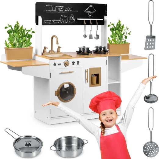 Descoperă farmecul jocului de-a gătitul cu bucătăria robustă din lemn RICOKIDS. Oferă uși care se deschid, butoane rotative, robinete reale la chiuvetă și un set bogat de vase din oțel inoxidabil incluse. Copiii se vor bucura de un joc fantastic de rol, dezvoltând motricitatea fină, creativitatea și colaborarea între frați datorită designului suficient de încăpător.