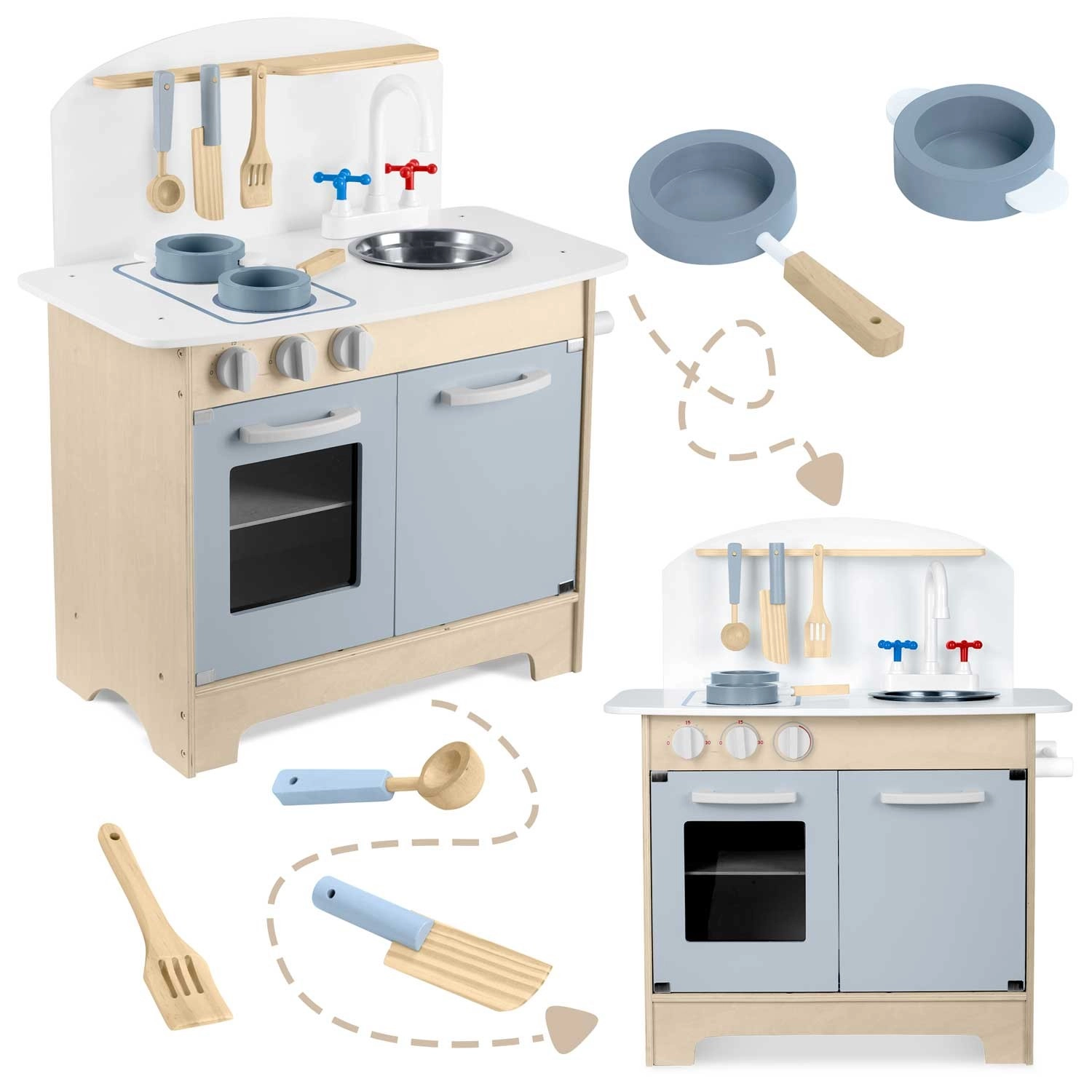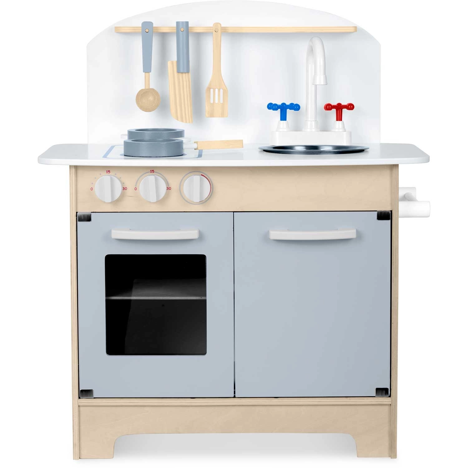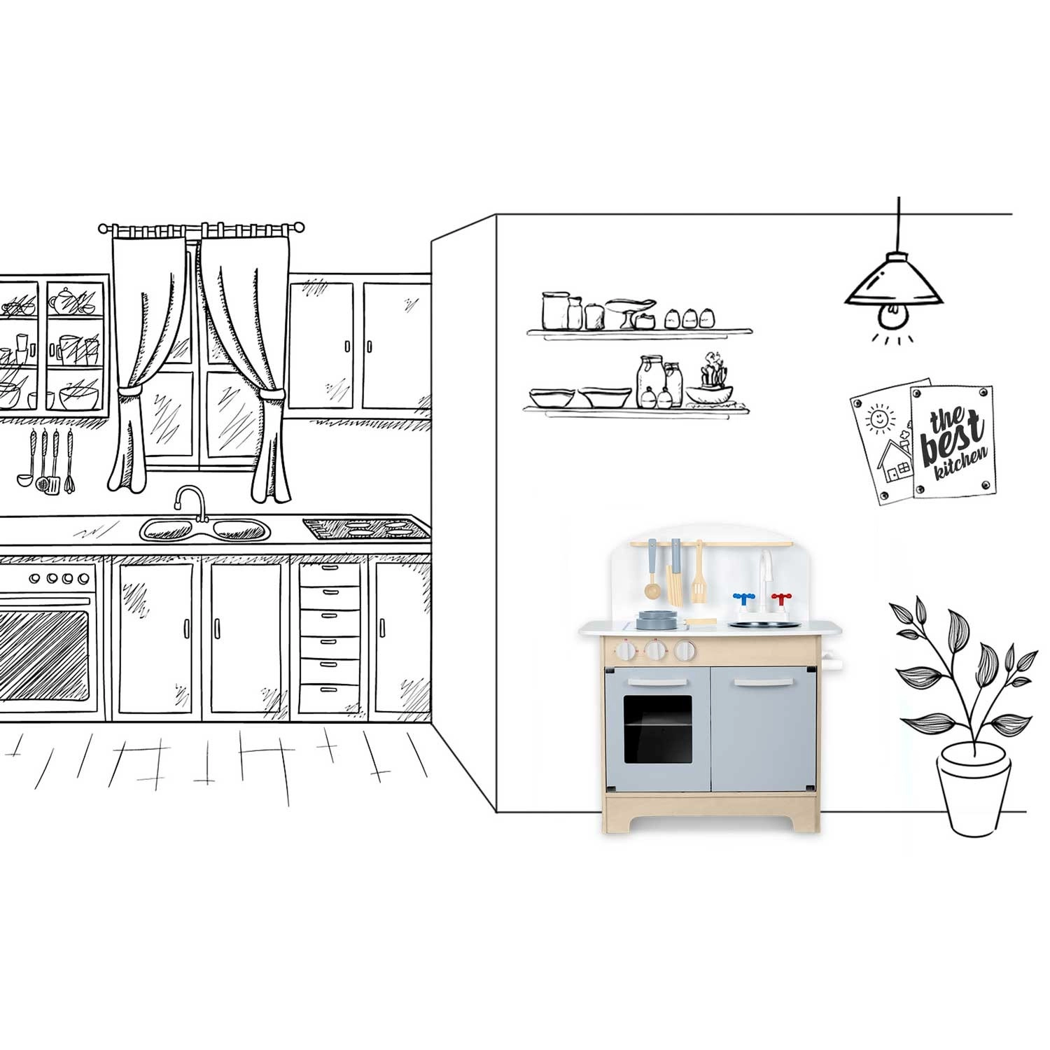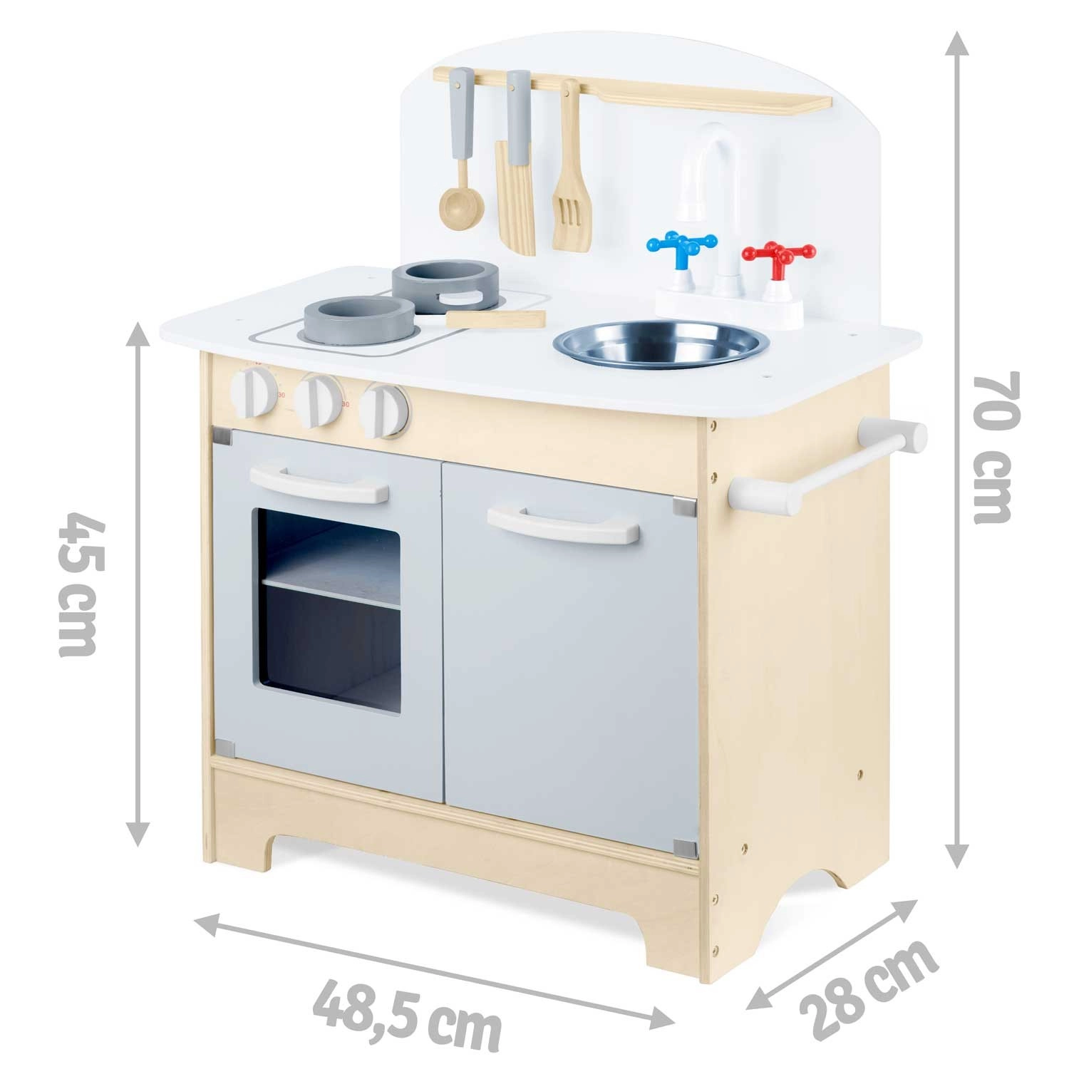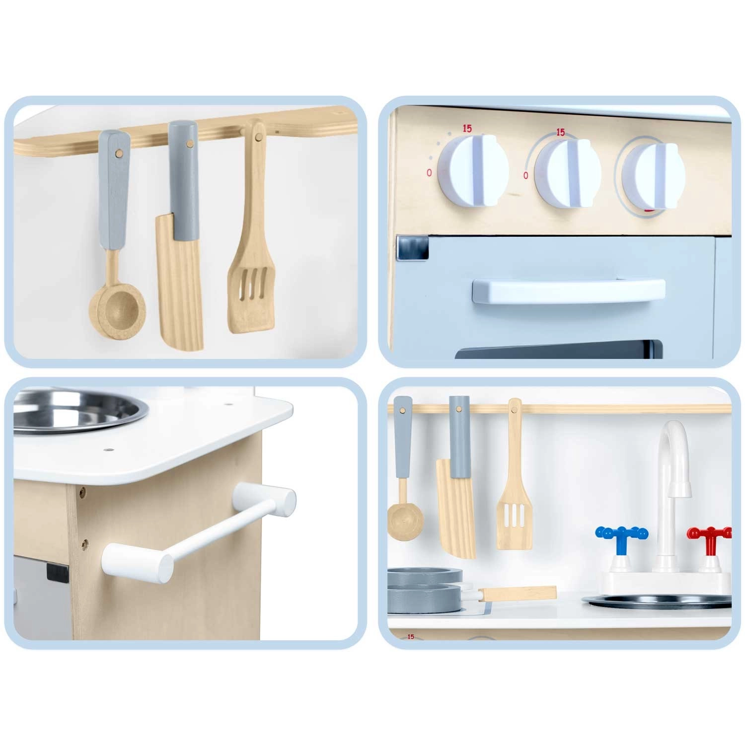 Spațiile de depozitare gândite, precum dulăpior pentru veselă, rafturi și cârlige pentru ustensile sau suport pentru prosoape de hârtie, mențin ordinea în timpul „gătitului”. Sunt incluse accesorii: oală, tigaie, lingură, spatulă și cuțit. Construcția durabilă din lemn, în stil retro minimalist, devine o decorațiune elegantă a camerei copilului.