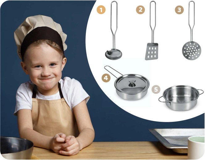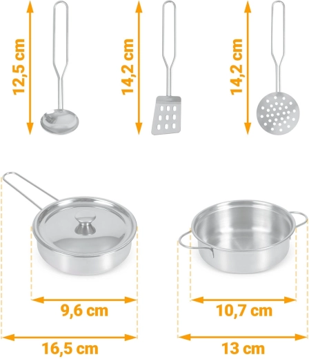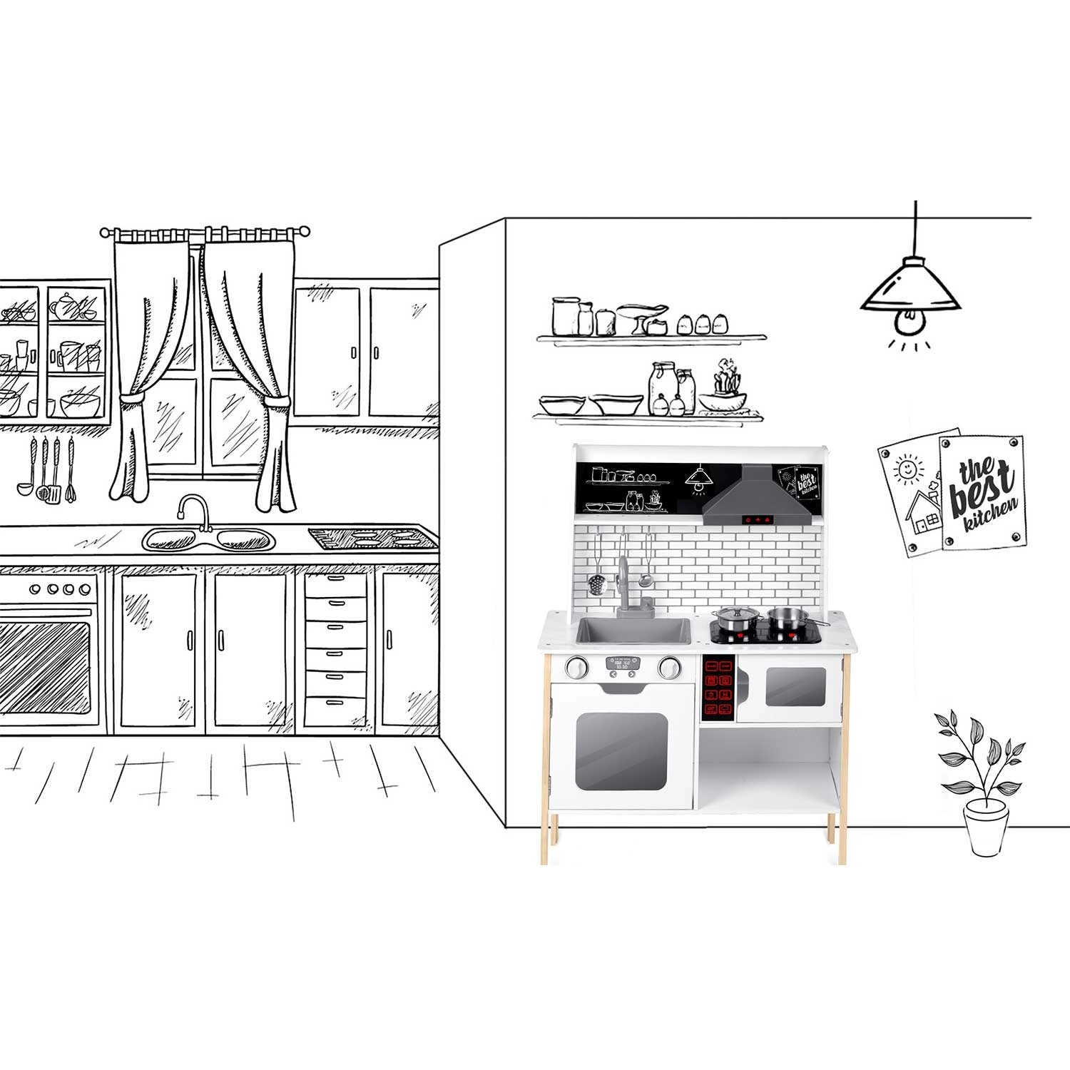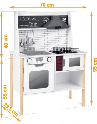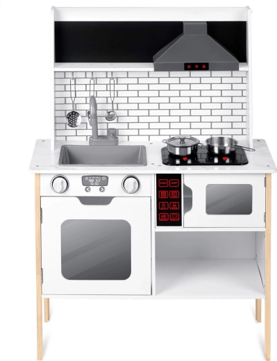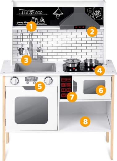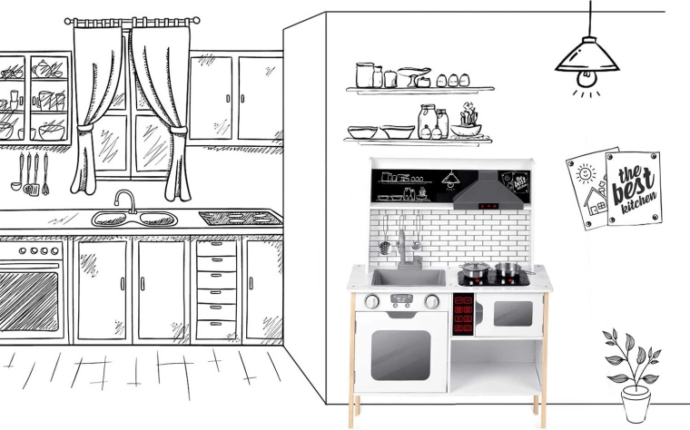 Sunt incluse numeroase accesorii: crăticioară, oală, strecurătoare, polonic, spatulă și capac. Copiii pot scrie cu cretă meniul pe suprafața tip tablă, pot exersa colaborarea și abilitățile sociale și pot imita în siguranță activitățile adulților – de la spălatul vaselor la coptul în cuptor.
