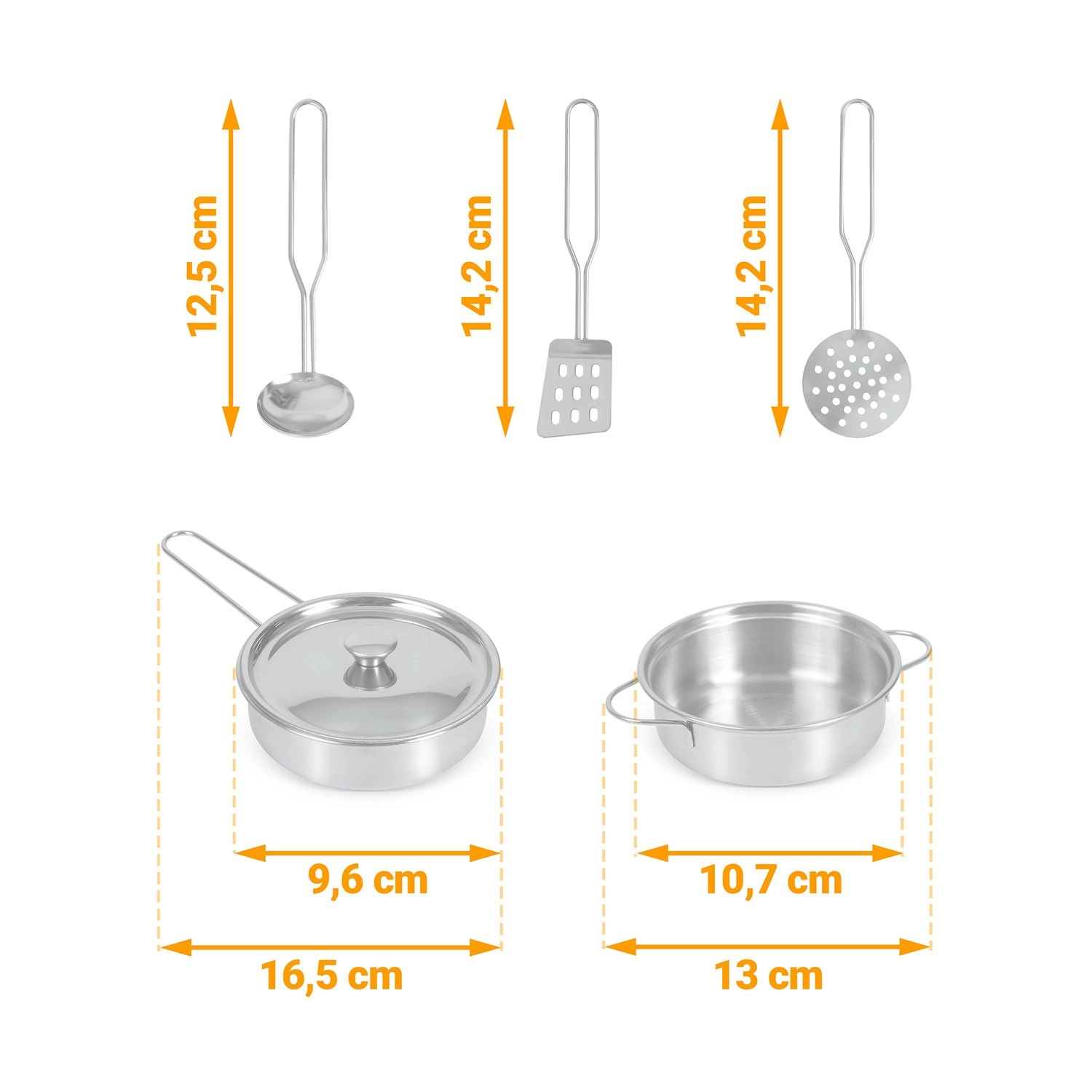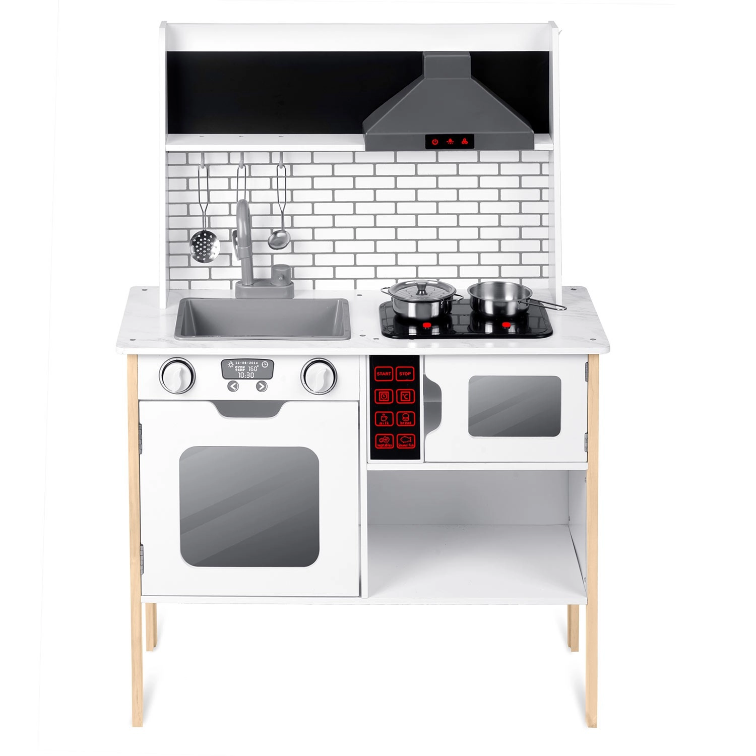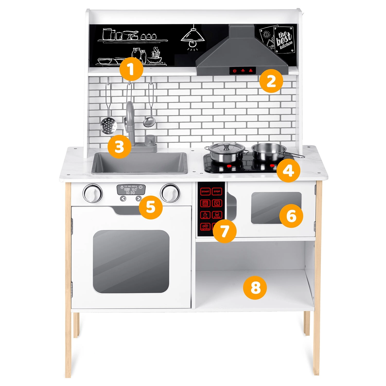 Sunt incluse numeroase accesorii: crăticioară, oală, strecurătoare, polonic, spatulă și capac. Copiii pot scrie cu cretă meniul pe suprafața tip tablă, pot exersa colaborarea și abilitățile sociale și pot imita în siguranță activitățile adulților – de la spălatul vaselor la coptul în cuptor.