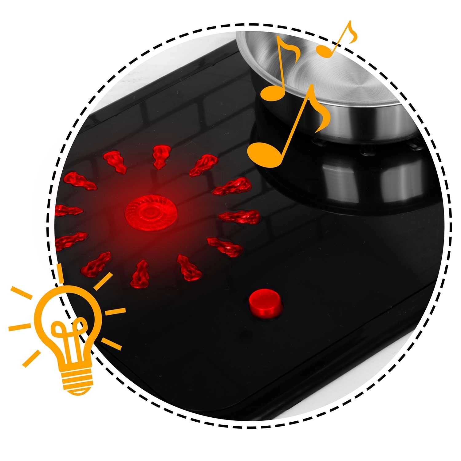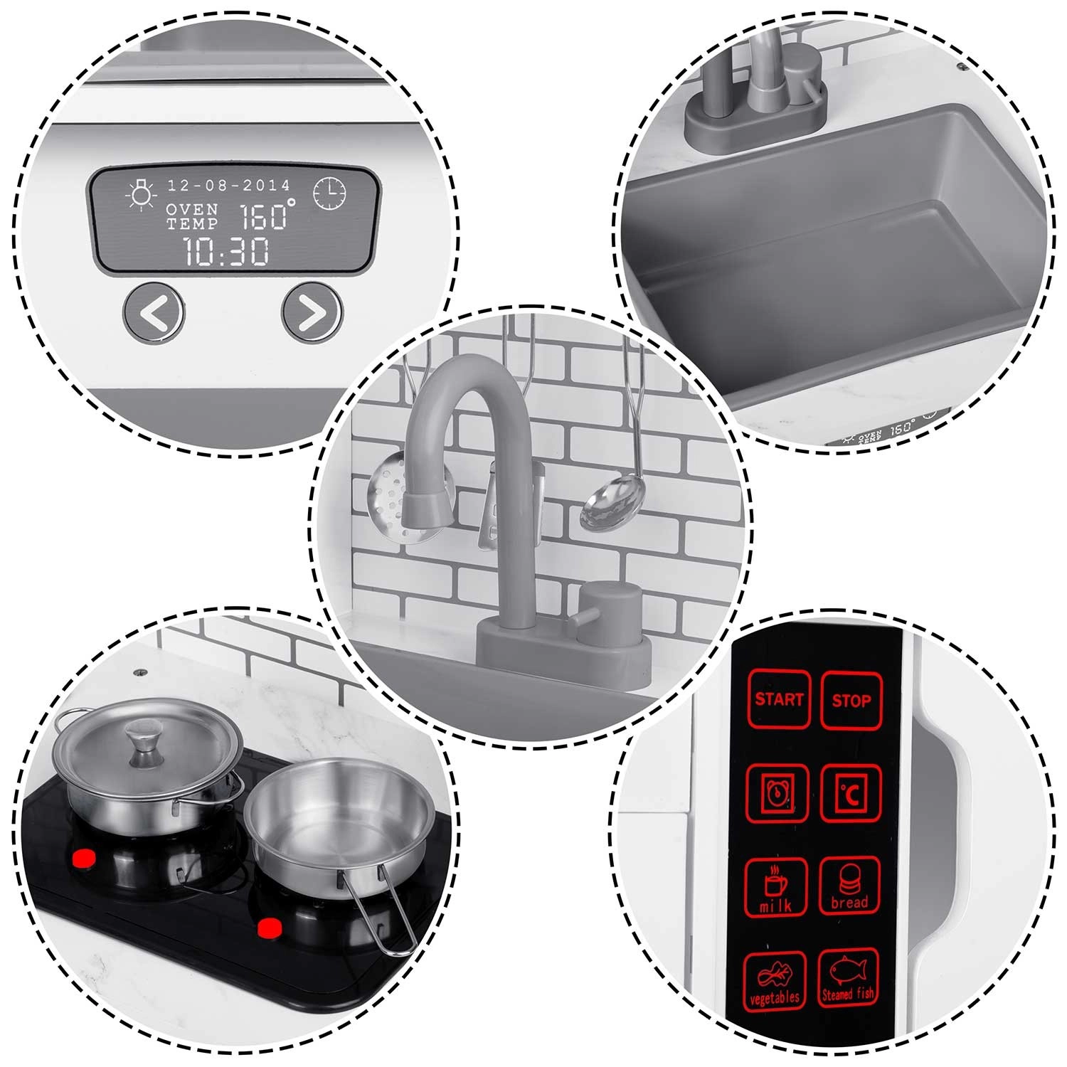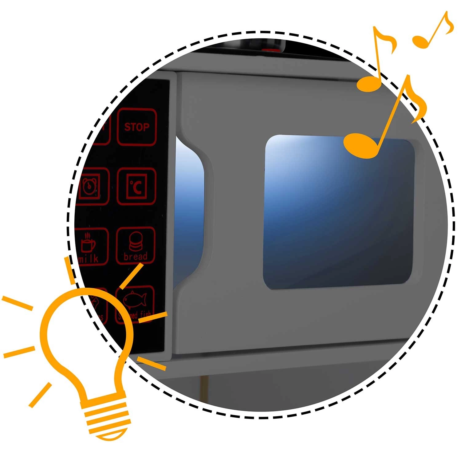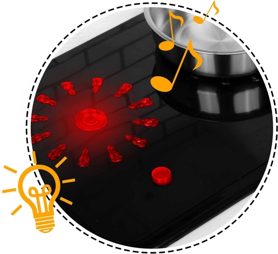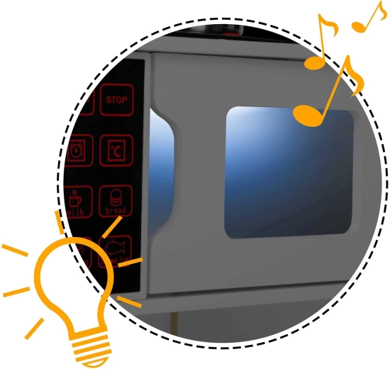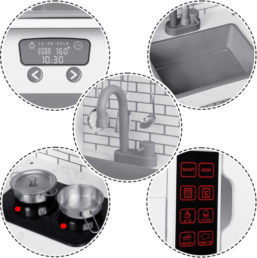 La apăsarea butonului, arzătoarele se aprind și redau sunete fine de gătit, precum fierberea apei – o imitație distractivă și sigură a unei bucătării adevărate.