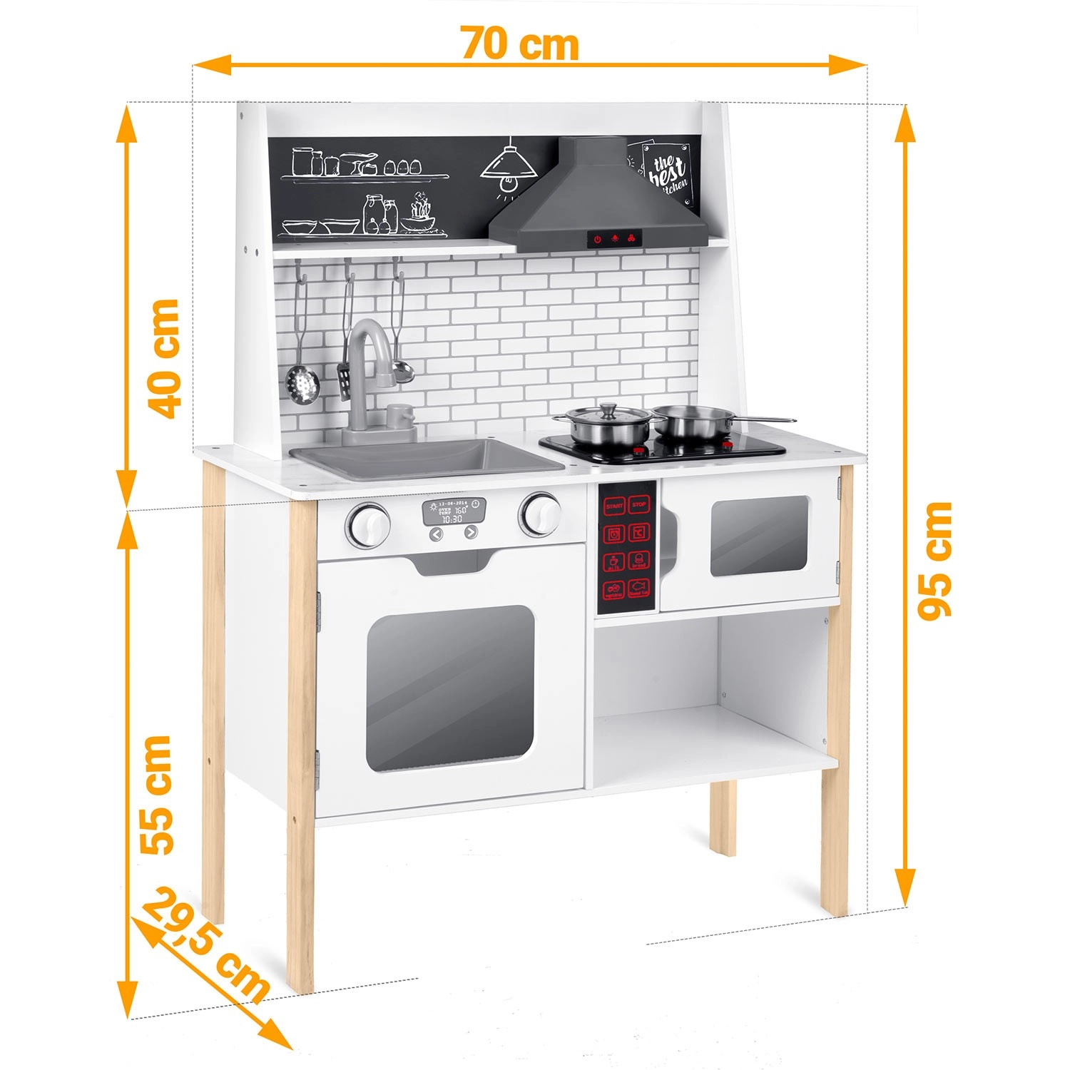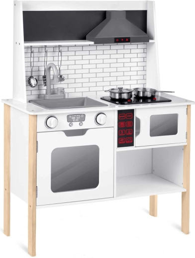 Bucătăria pentru copii RICOKIDS RC-846 este un set din lemn bine gândit, care transformă camera copilului într-un mic restaurant. Iluminarea LED a hotei și a cuptorului cu microunde, arzătoarele luminoase și cu sunet și panoul de control cu efecte sonore creează o experiență autentică de gătit. Construcția minimalistă și stabilă se potrivește perfect în interioarele moderne și, datorită materialelor de calitate, rezistă la ani de joacă.