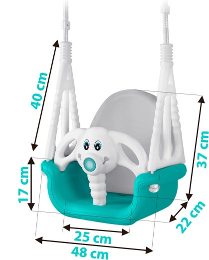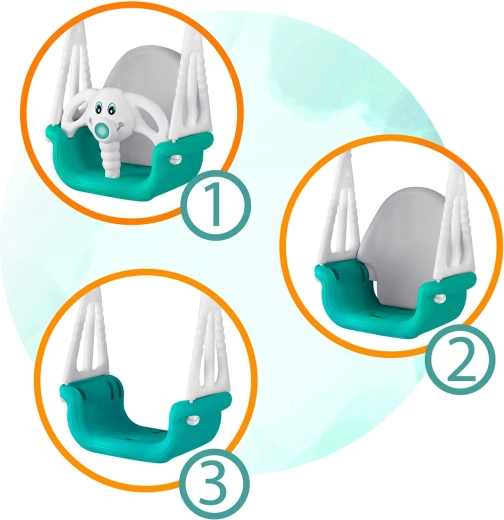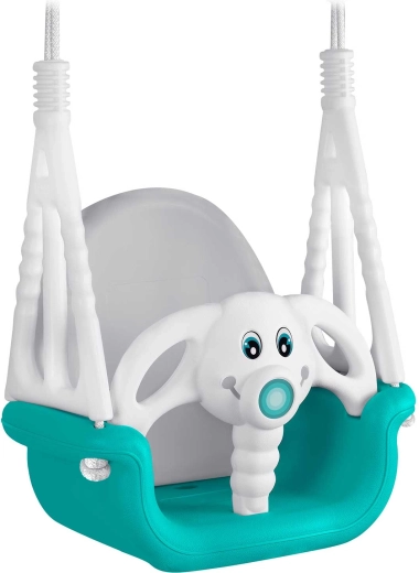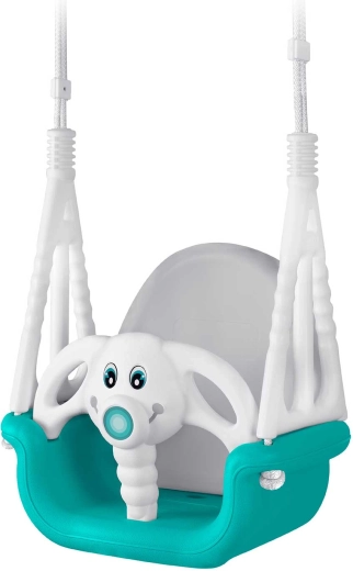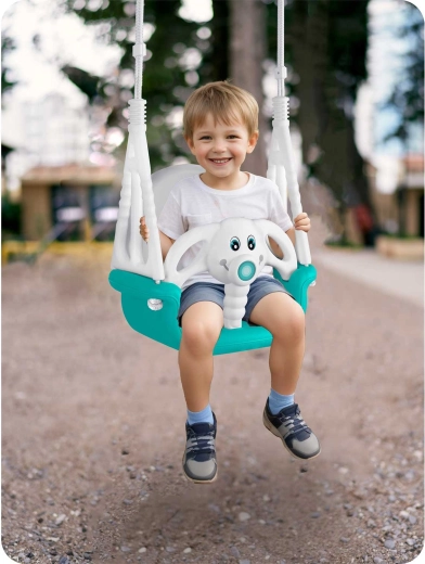Leagăn universal pentru copii 3în1 cu motiv jucăuș de elefănțel, crește odată cu copilul tău de la 6 luni până la 10 ani. Oferă spătar înalt, bară frontală de siguranță și frânghii rezistente, reglabile pentru legănat în siguranță atât acasă, cât și afară. Construcție din plastic impermeabil, șezut antiderapant și certificări CE, GS pentru liniștea părinților.