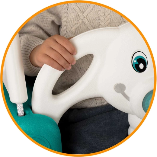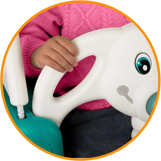 Spătarul înalt, șezutul antiderapant și bara frontală detașabilă mențin copilul în poziția corectă. Frânghii rezistente cu cârlige metalice și protecții din plastic sporesc stabilitatea și confortul.