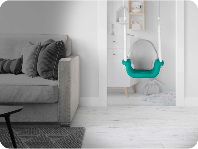 Leagănul este fabricat din plastic rezistent, impermeabil, șezutul are structură antiderapantă, iar cârligele metalice cu frânghii reglabile (aprox. 130 cm) asigură o suspendare stabilă. Poate fi folosit în interior și în exterior – funcționează excelent în cadrul ușii (de ex. cu o bară extensibilă) sau în grădină. Kitul de montaj este inclus, astfel că instalarea este rapidă și ușoară.