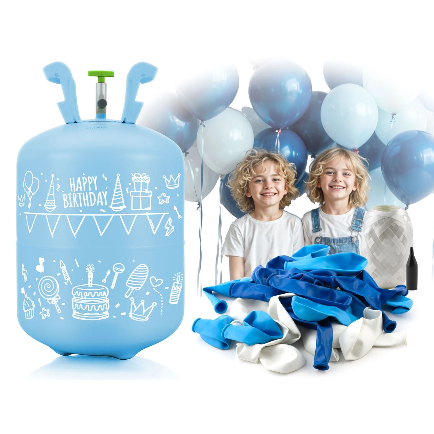 - Butelie cu heliu 0,20 m³, 30× baloane (alb, albastru deschis, albastru închis), 40 m panglică decorativă, ambalaj cadou colorat, instrucțiuni și avertismente (PL)