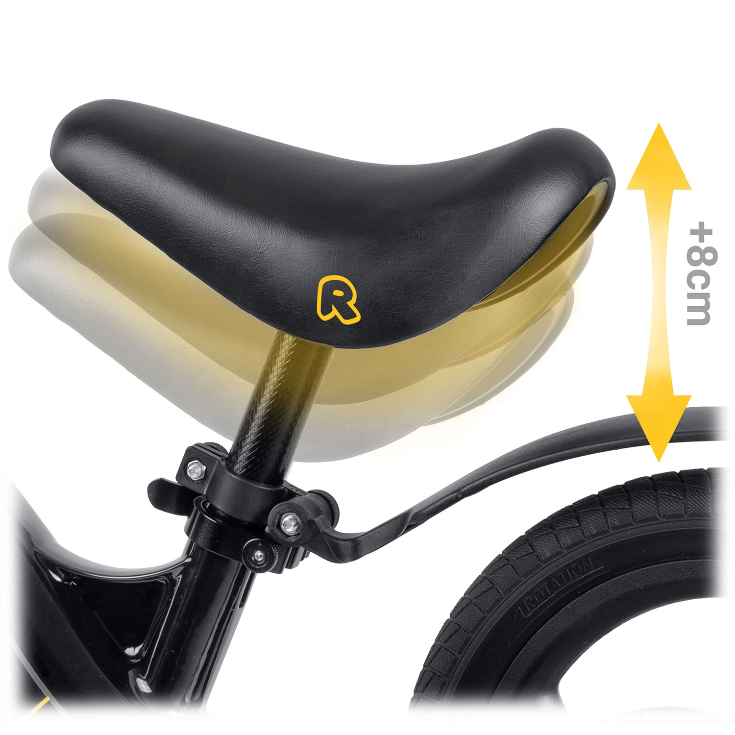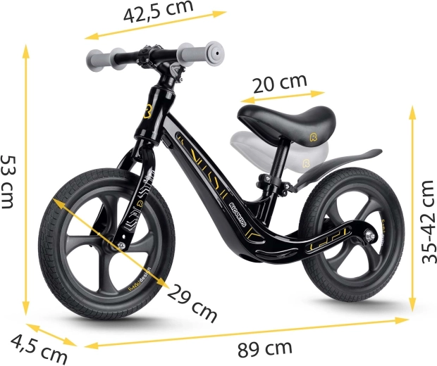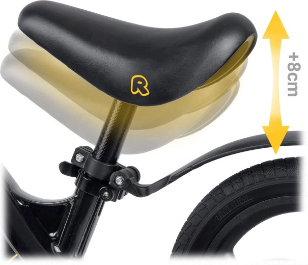 Șaua ergonomică, moale, cu interval de reglare de aprox. 35–42 cm se adaptează ușor la înălțimea copilului și asigură o poziție comodă în fiecare etapă a învățării.