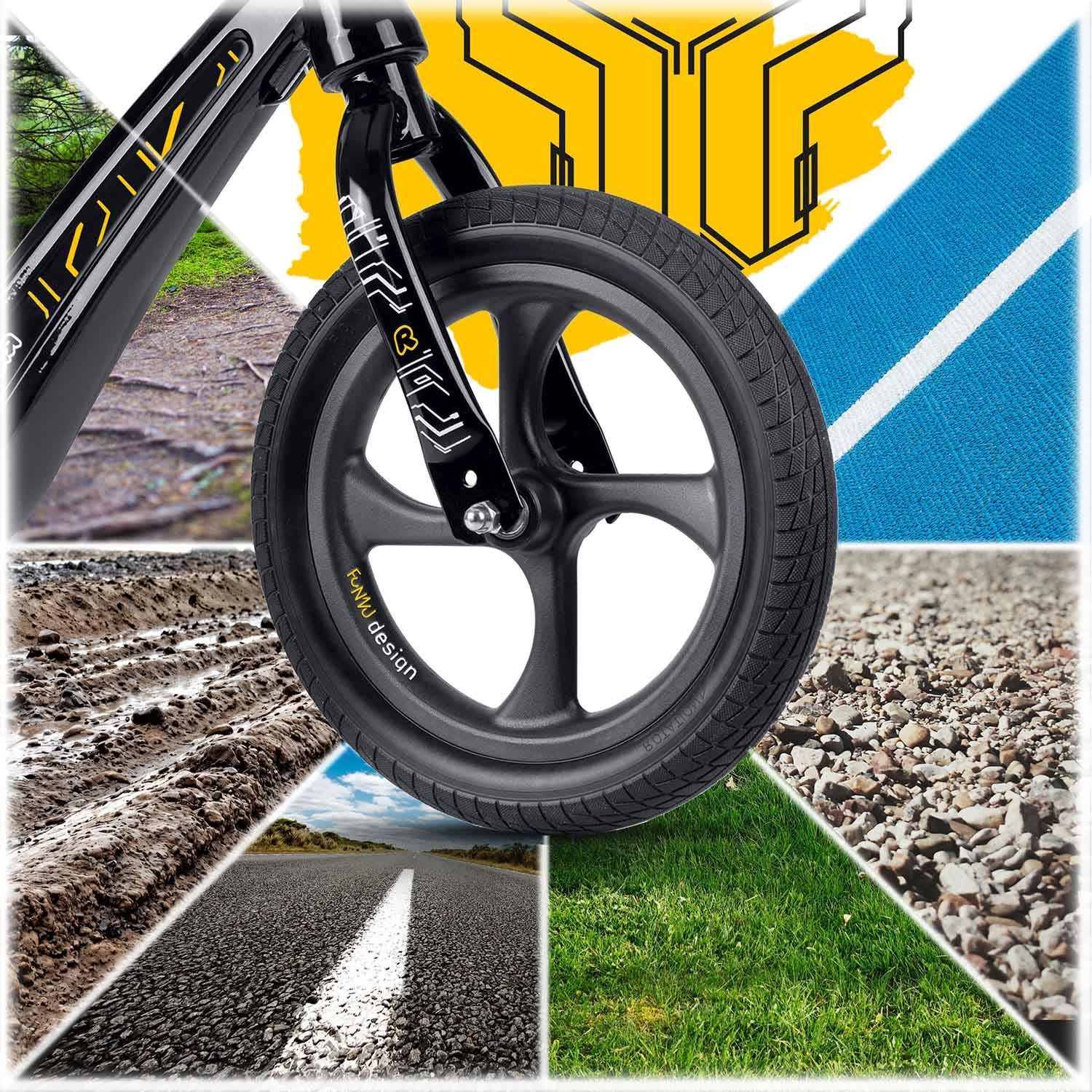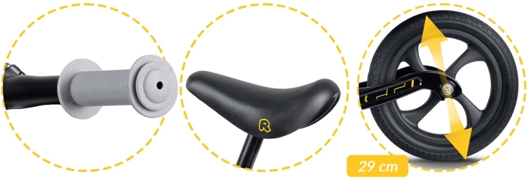 Siguranța și controlul sunt susținute de mânerele antiderapante cu opritoare și geometria stabilă cu urcare joasă. Bicicleta este silențioasă chiar și pentru utilizare în interior și face față foarte bine ierbii, asfaltului și pietrișului fin. Datorită construcției ușoare, se manevrează ușor chiar și de către cei mici, iar părinții vor aprecia curățarea facilă și rezistența la umiditate și radiații UV.