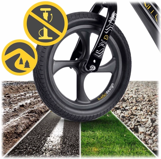 - Plimbare fără griji: roțile EVA nu necesită umflare, nu sunt predispuse la perforare și își păstrează forma chiar și la frig.