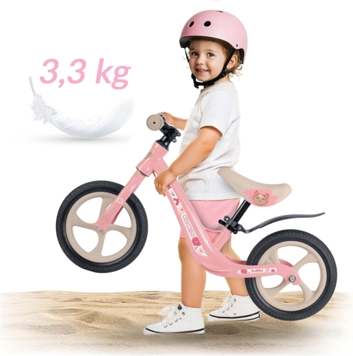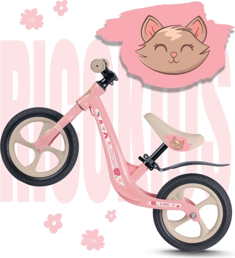 Bicicleta de echilibru ușoară și manevrabilă RICOKIDS FUNNU, cu cadru din aliaj de magneziu, ajută la dezvoltarea echilibrului și coordonării. Oferă înălțime reglabilă a șeii, roți EVA de 12" care nu se sparg și șea ergonomică moale pentru o plimbare confortabilă. Manșoanele din cauciuc cu opritoare asigură o prindere sigură și protecție. Ideală pentru primele aventuri pe două roți, acasă și în aer liber.