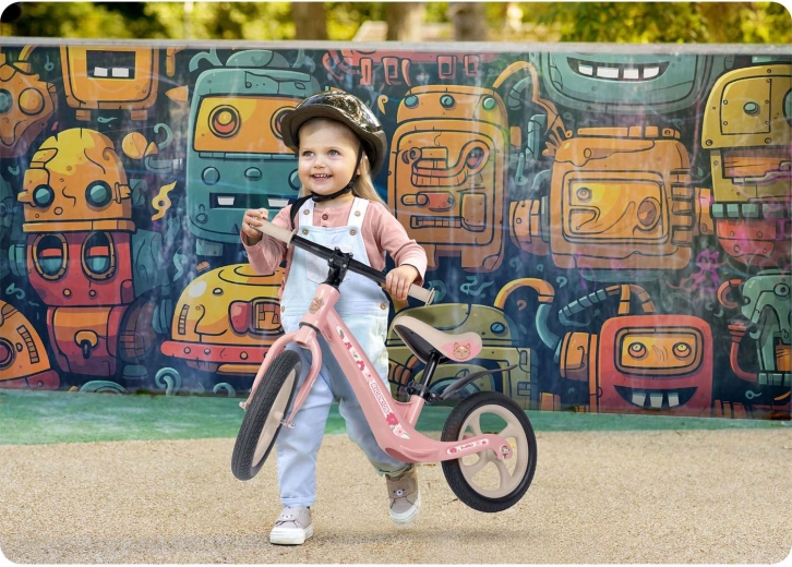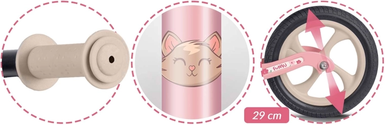 Siguranța și confortul sunt pe primul loc: manșoanele antiderapante cu opritoare oferă control asupra direcției, șaua moale din spumă protejează spatele și șezutul, iar ghidonul lat ajută la menținerea stabilității. Bicicleta de echilibru susține dezvoltarea naturală a echilibrului, coordonării și concentrării – trecerea la o bicicletă clasică cu pedale devine o joacă.