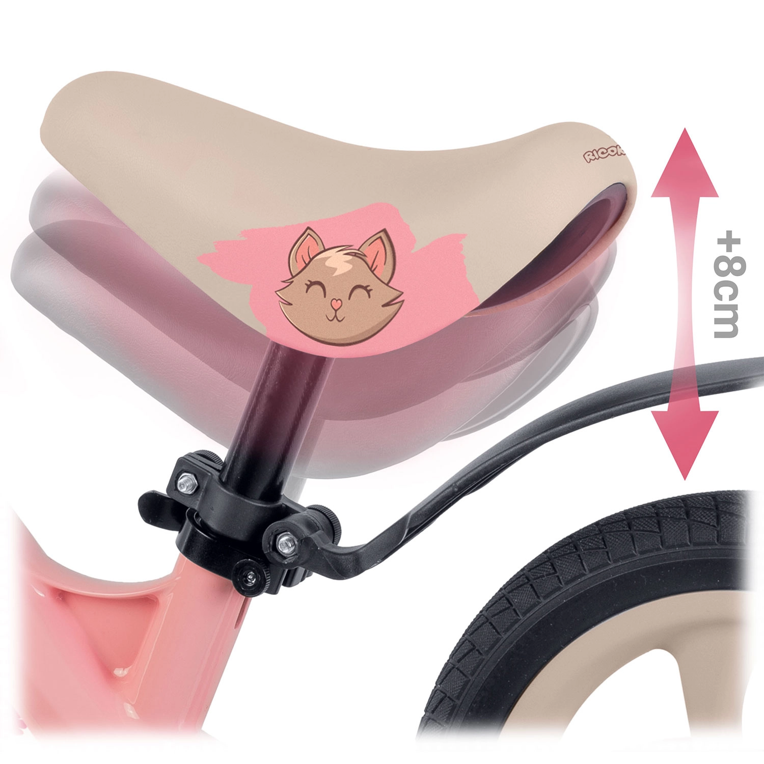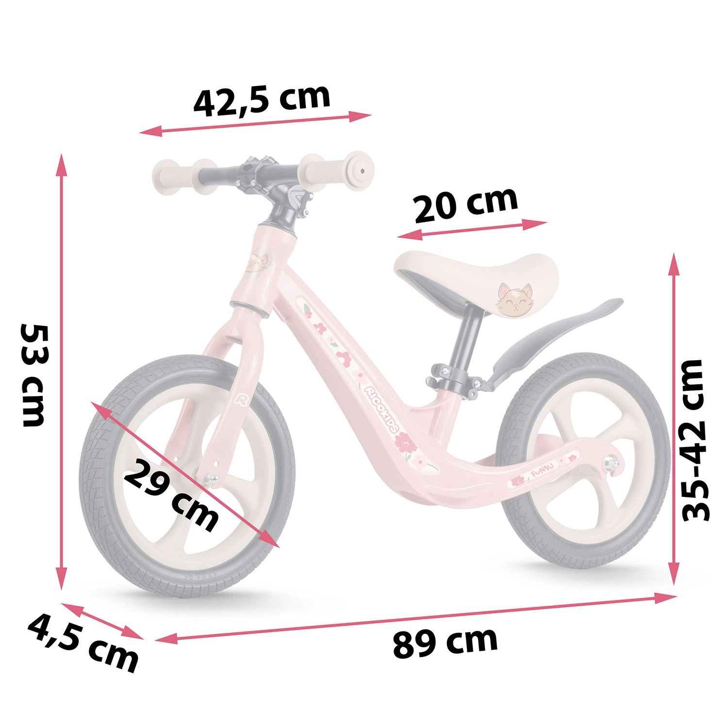 Domeniul de înălțime 35–42 cm permite ajustarea corectă a poziției în fiecare etapă de creștere. Șaua ergonomică din spumă asigură confort la plimbări scurte și lungi.