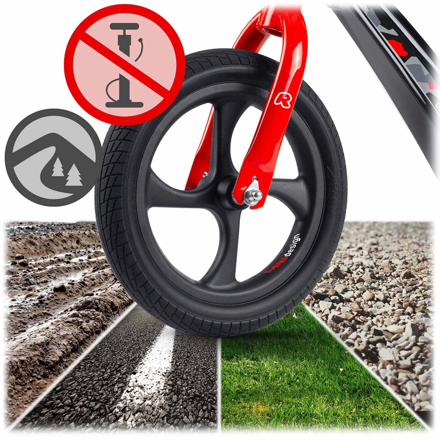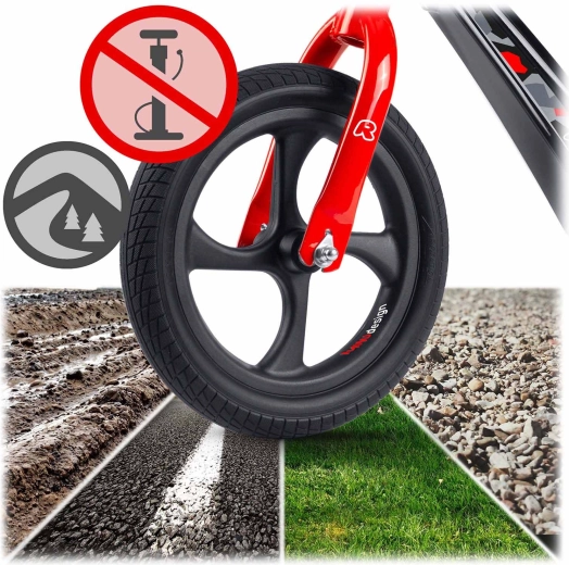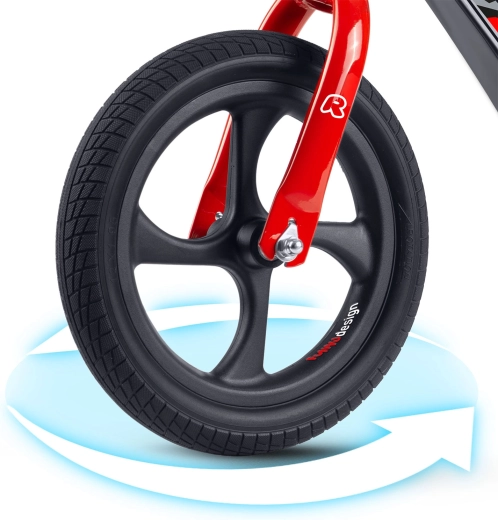 Roțile durabile de 12" din spumă EVA nu necesită umflare, nu se înțeapă și absorb excelent denivelările. Se curăță ușor și asigură o rulare silențioasă pe diverse suprafețe.