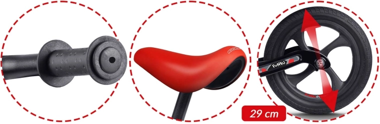Pentru siguranță și confort, are mânere antiderapante cu opritoare pentru o priză sigură, șea moale ergonomică pentru plimbări mai lungi și o geometrie gândită pentru urcare ușoară. Mersul pe bicicleta de echilibru dezvoltă abilitățile de coordonare, echilibrul și concentrarea, consolidând astfel încrederea micilor cicliști.