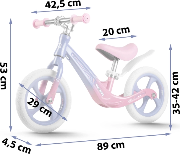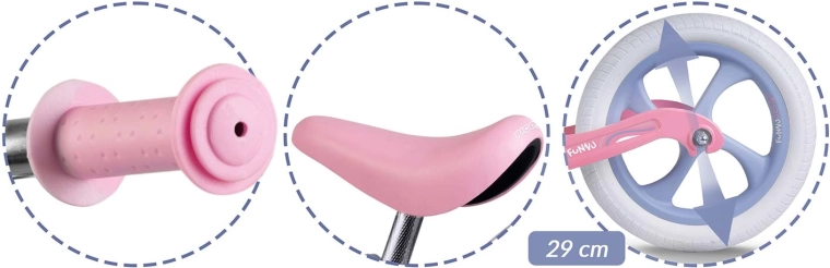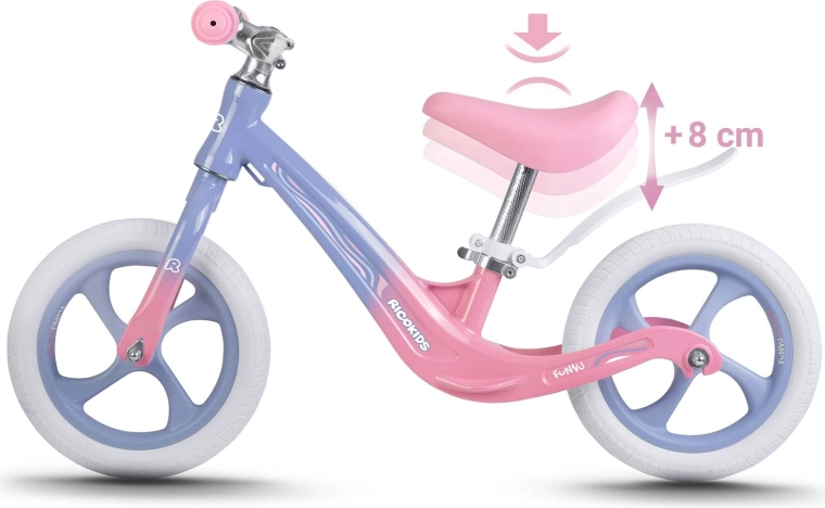 Ricokids Funnu este o bicicletă de echilibru concepută pentru a facilita copiilor trecerea la o bicicletă clasică cu pedale. Cadrul din magneziu oferă greutate redusă excepțională și rezistență, în timp ce anvelopele din spumă EVA nu necesită umflare și sunt rezistente la înțepături, umiditate și temperaturi scăzute. Șaua ergonomică, moale, capitonată și posibilitățile largi de reglare a înălțimii oferă confort în fiecare etapă a creșterii.