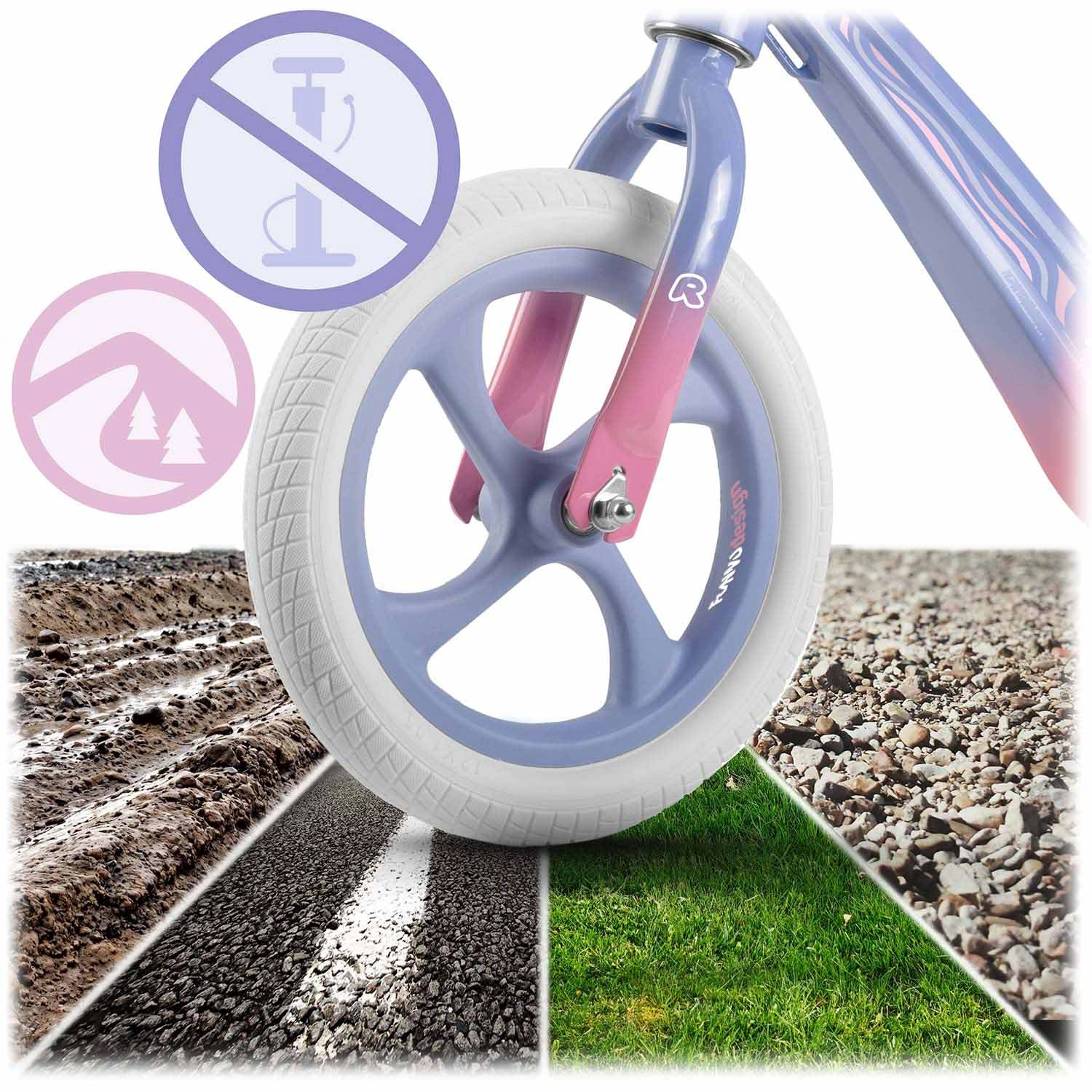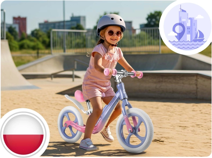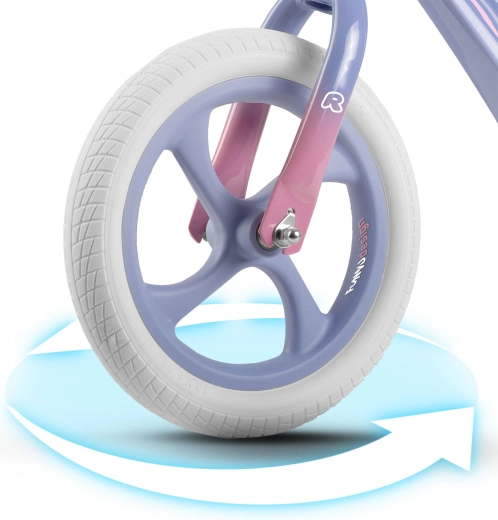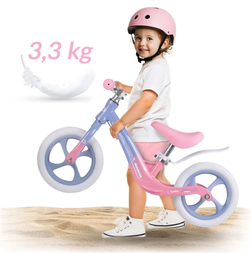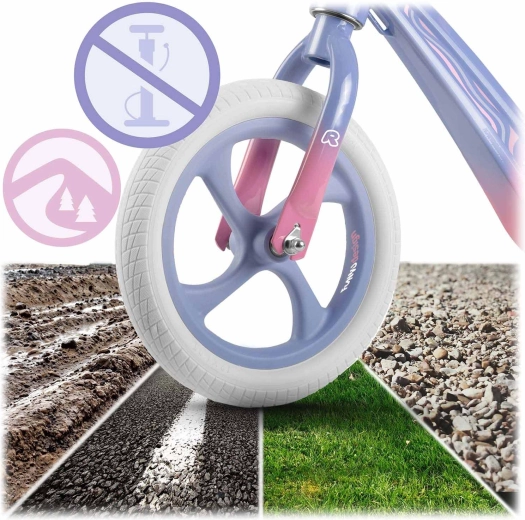 Pentru o rulare mai sigură și mai stabilă, sunt disponibile ghidon lat cu mânere antiderapante și opritoare la capete, care protejează mâinile copilului. Roțile mari de 12" asigură o deplasare lină și silențioasă atât în interior, cât și în exterior – pe iarbă, asfalt și alei consolidate. Datorită construcției compacte, bicicleta de echilibru este ușor de transportat și ideală pentru utilizarea zilnică.