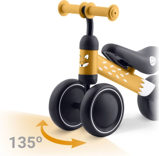 Unghiul limitat și sigur de rotire a ghidonului previne răsucirea bruscă și ajută la menținerea direcției. Roțile late din plastic, cu diametrul de 15 cm, asigură stabilitate atât în interior, cât și afară, iar șaua moale din spumă și mânerele din cauciuc cu opritoare sporesc confortul și siguranța.