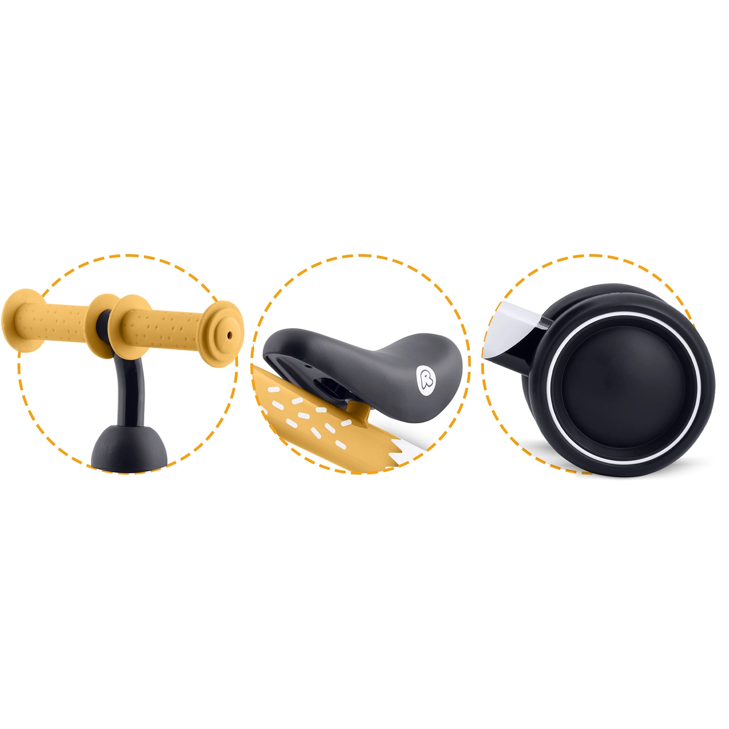 Șaua moale, cu poziție joasă, le permite copiilor să ajungă în siguranță cu picioarele la sol, să se împingă confortabil și să se oprească ori de câte ori este necesar.