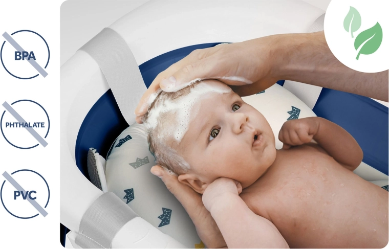 Suportul ergonomic ține delicat capul și spatele bebelușului. Trei curele reglabile asigură o fixare stabilă fără alunecare, iar materialul cu uscare rapidă garantează igiena după fiecare baie.