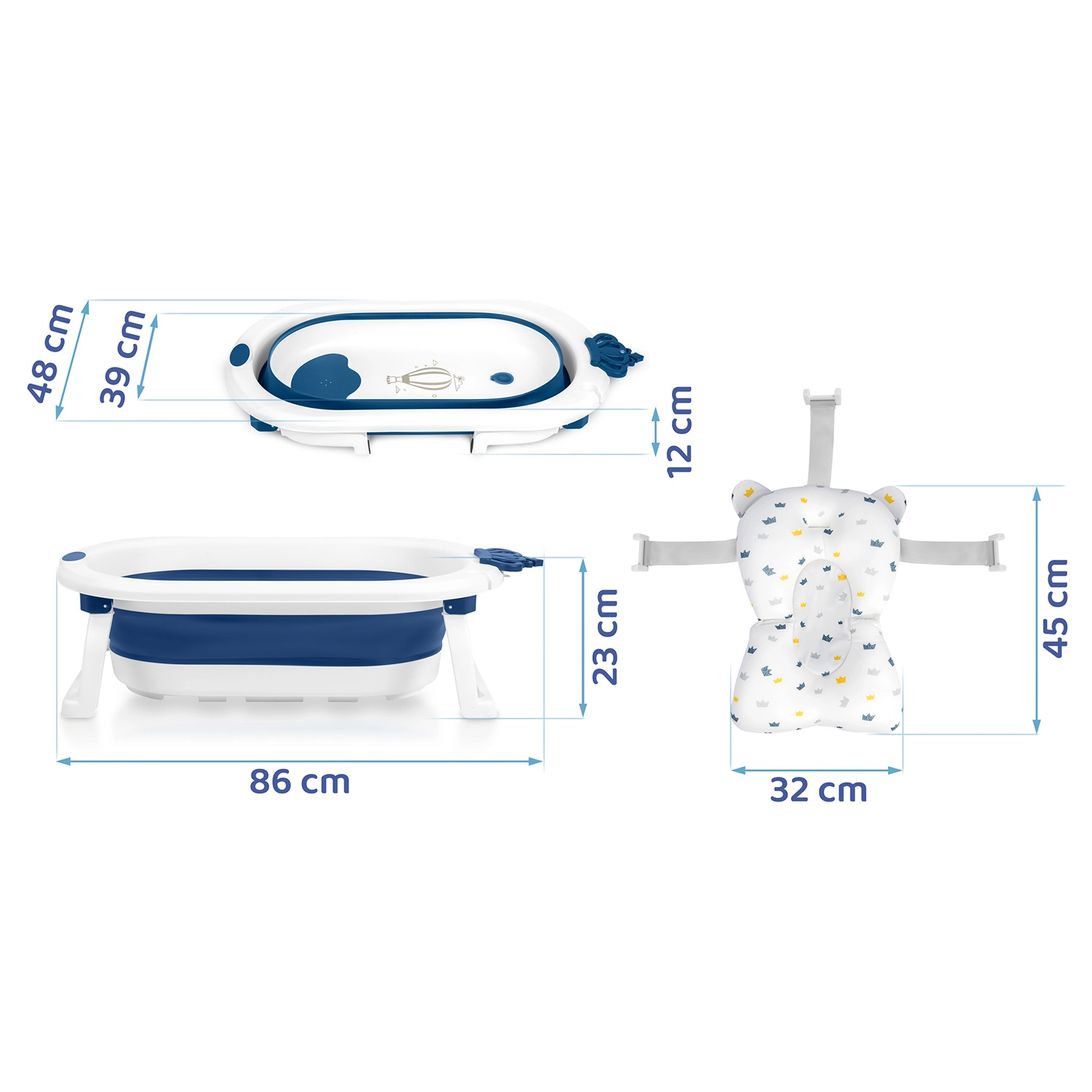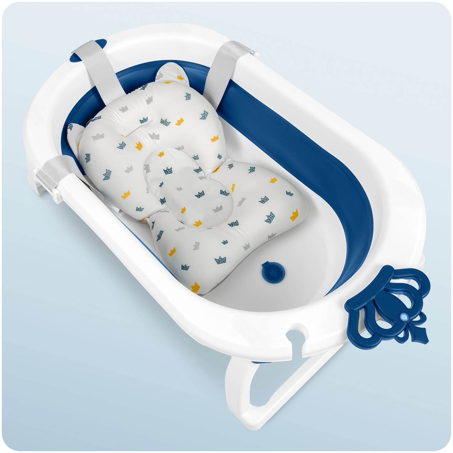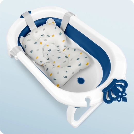 Cădiță pliabilă practică și sigură pentru bebeluși și copii mai mari, oferă greutate redusă și dimensiuni compacte, picioare rabatabile stabile cu strat antiderapant și dop termic care își schimbă culoarea peste 38 °C. Include insert moale, cu uscare rapidă, pentru nou-născuți cu benzi reglabil-e pentru fixare sigură. Ideală pentru baie și călătorii – îmbăiere confortabilă fără stropi datorită suportului pentru para de duș.