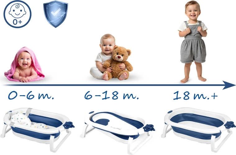 - 0–6 luni cu insert; 6–18 luni fără insert; 18 m+ spațiu mai generos pentru îmbăiere