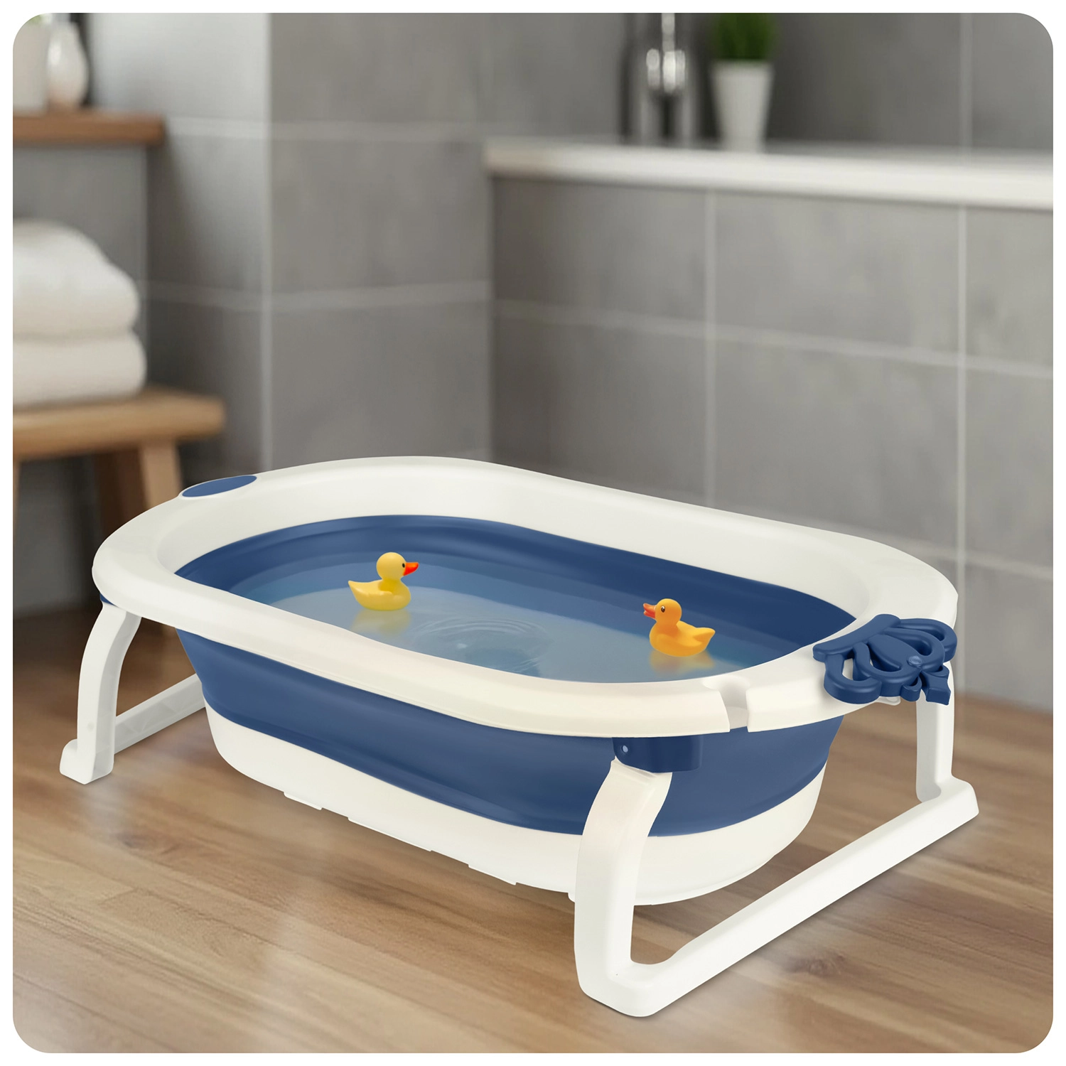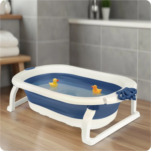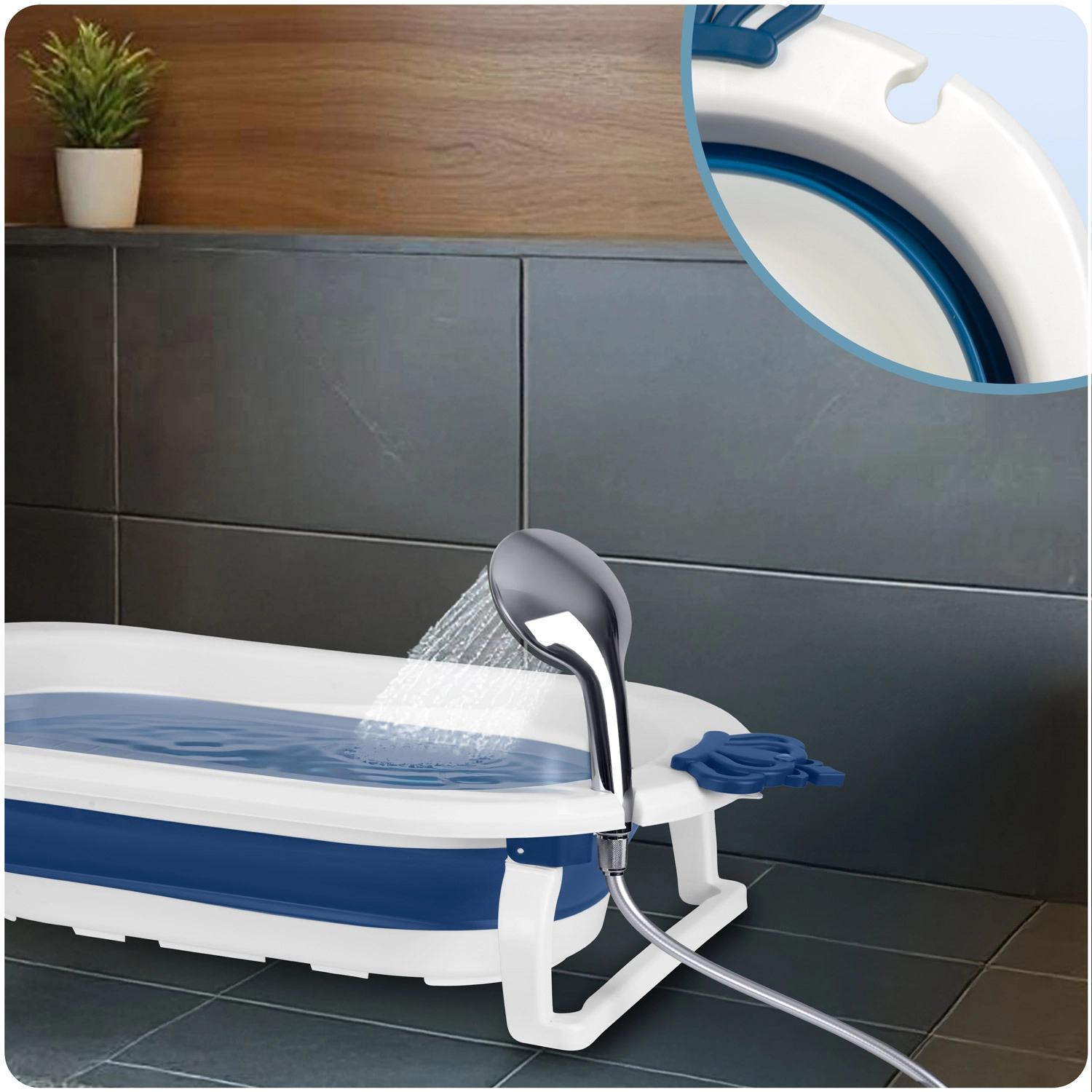 Dimensiunile compacte după pliere economisesc spațiu în baie și la călătorii. Suportul integrat pentru para de duș facilitează umplerea cu apă fără împroșcare.