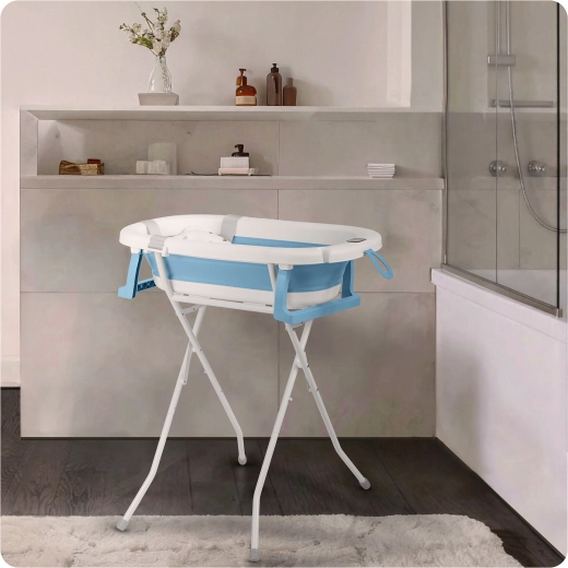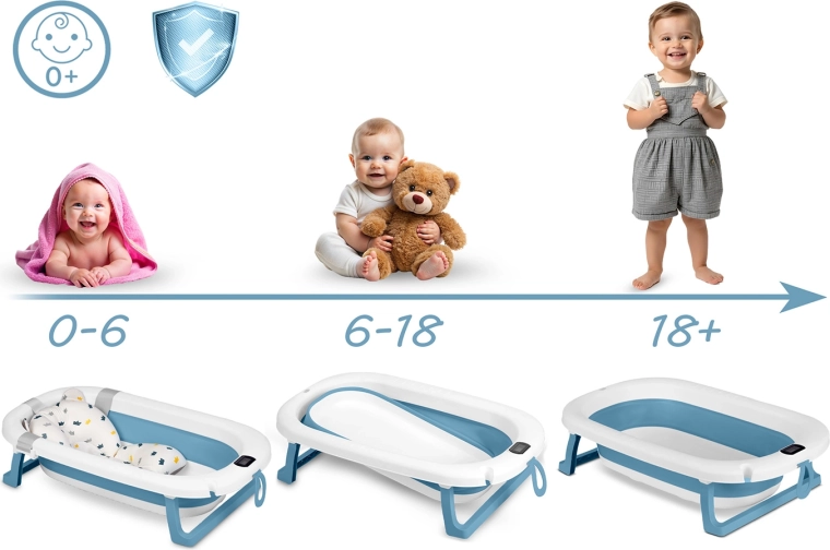 Crește odată cu copilul și economisește spațiu. Cădița este pliabilă, ușoară și portabilă – ideală pentru băi mici și pentru călătorii. Folosește-o cu inserția pentru nou-născuți (0–6 luni), singură pe suport pentru bebelușii care stau în șezut (6–18 luni) și ulterior ca spațiu generos de bălăceală pentru preșcolarii curioși (18 luni+). Materialele fără BPA respectă standardele europene stricte de siguranță.