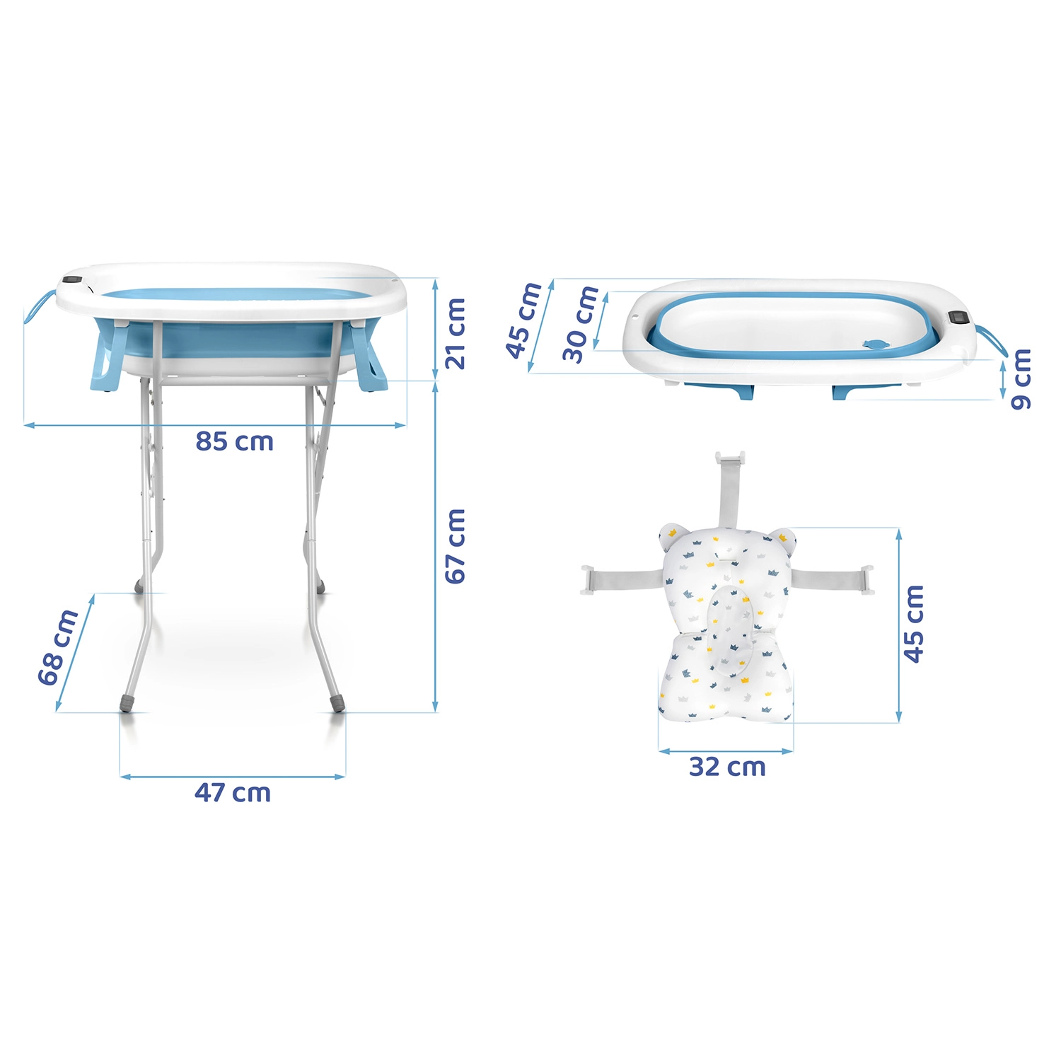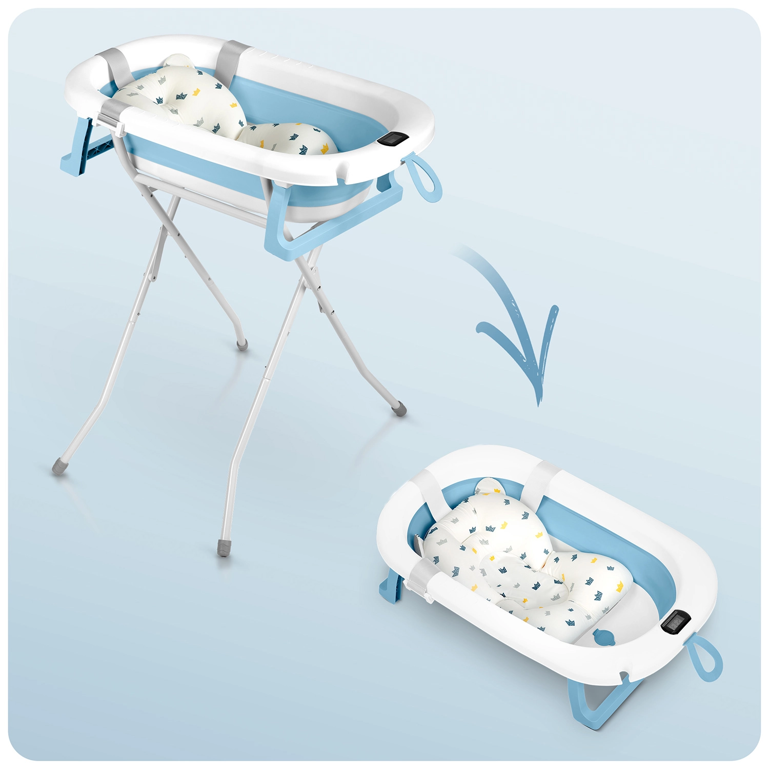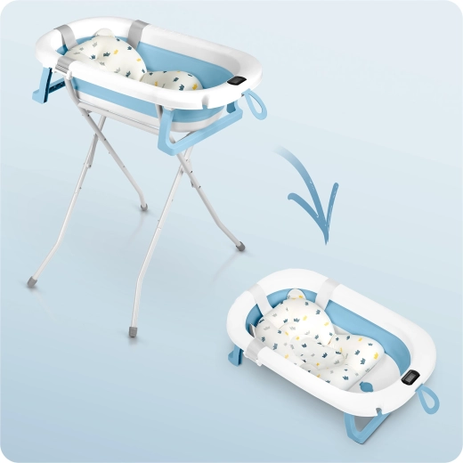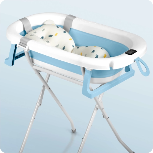 Cădiță practică și sigură pentru copii, care crește odată cu copilul – de la nou-născut până la preșcolar. Datorită construcției pliabile, suportului solid și inserției moi, baia este confortabilă și fără stres. Termometrul electronic integrat, cu sondă precisă și dop care își schimbă culoarea, ajută la setarea temperaturii ideale a apei. Cădița este o alegere ușoară, stabilă și compactă pentru îngrijirea zilnică și pentru călătorii.