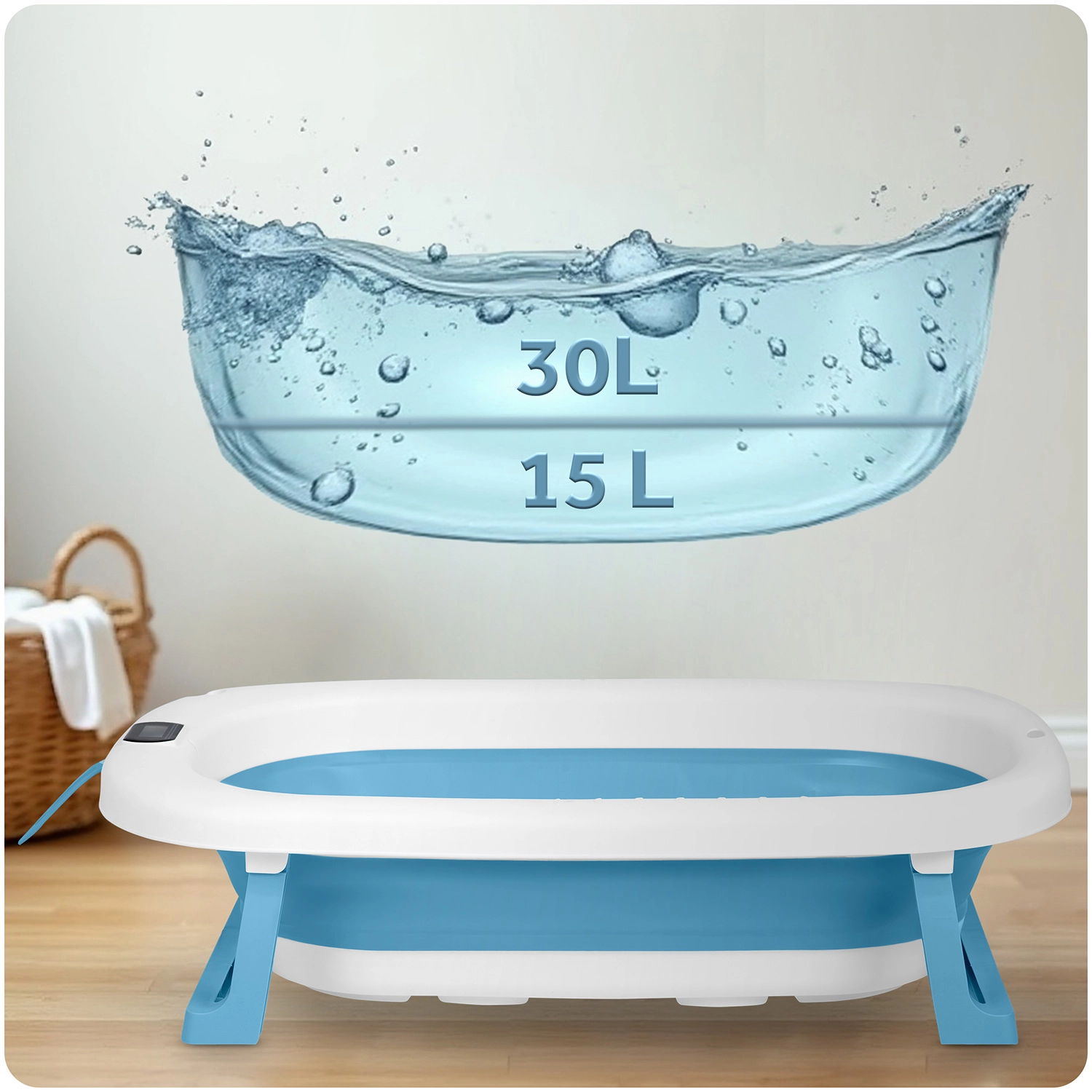 Echipare inteligentă pentru o baie ușoară. Termometrul electronic cu afișaj LCD lizibil monitorizează continuu temperatura apei. Suportul integrat pentru para de duș permite umplerea fără stropire și îți lasă ambele mâini libere la spălat. Datorită mânerelor laterale și orificiului de agățare, cădița se transportă și se depozitează ușor.
