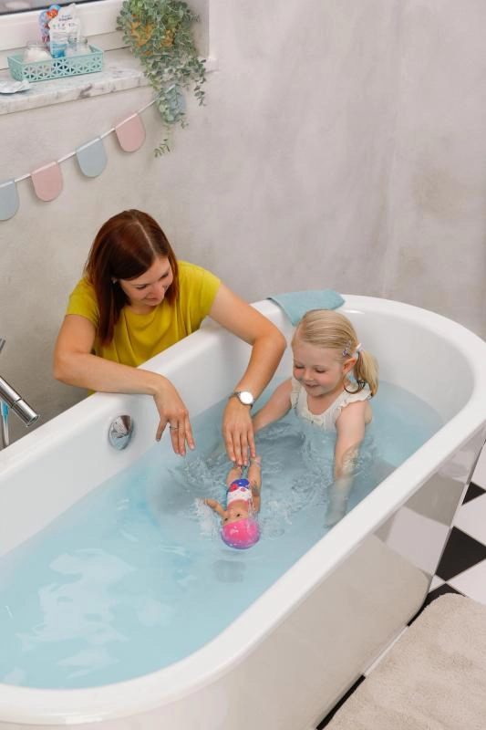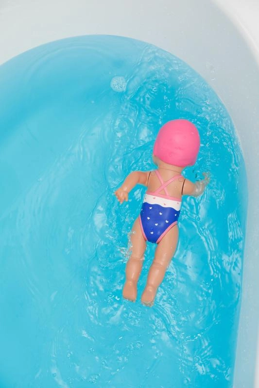 Păpușa BABY born înotătoare Lizzie este grozavă pentru primele experiențe pozitive cu apa. Este suficient să-i întoarceți ușor brațele, să o așezați pe suprafața apei și priviți cum înoată singură. Mișcările realiste de crawl și fluture trezesc imaginația copiilor și susțin dezvoltarea motricității fine.