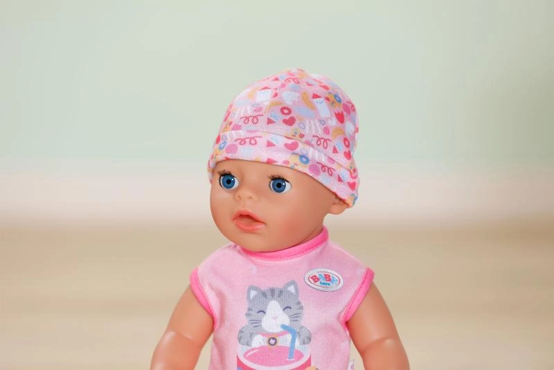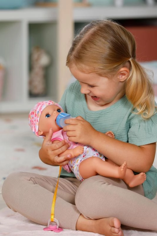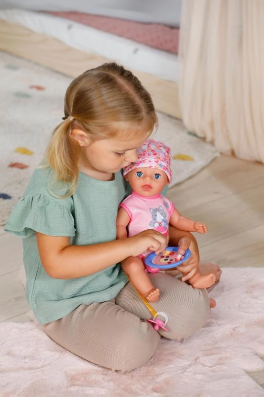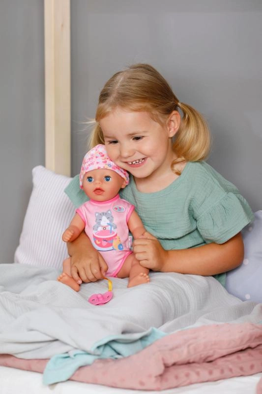Suzeta atașată de salopeta cu drăguț motiv de pisicuță permite păpușii să își deschidă și închidă ochii chiar și în poziție așezată. După ce este pusă în pătuț, își închide ochii singură, ca și cum ar adormi cu adevărat. Mâinile și picioarele mobile și capul rotativ ușurează îmbrăcarea și dezbrăcarea, astfel încât micii îngrijitori pot face totul singuri.