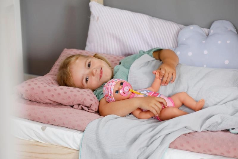 Păpușa își deschide și închide ochii cu ajutorul suzetei incluse, iar când este culcată în pătuț îi închide singură. Un efect grozav pentru ritualurile liniștitoare de seară.