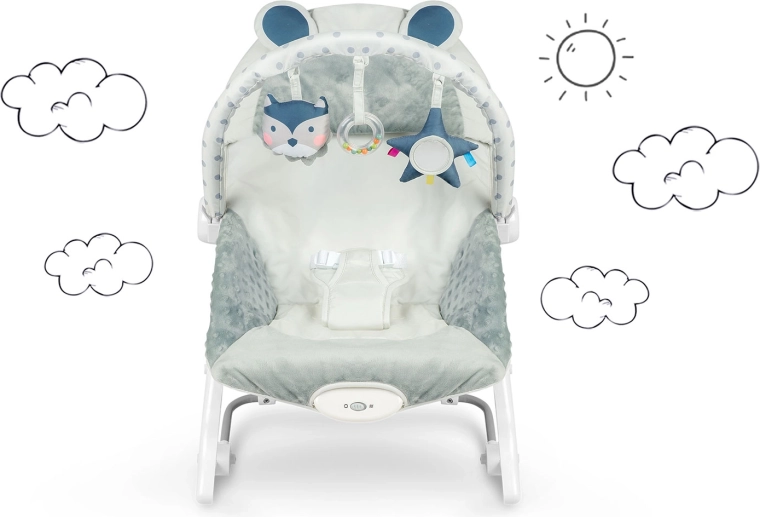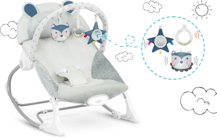 Ritmul liniștitor al legănării și funcția de vibrații opțională ajută bebelușul să se relaxeze și să adoarmă mai repede, în timp ce dumneavoastră aveți mâinile libere pentru mici treburi. Bara detașabilă cu jucării plușate foșnitoare și inel stimulează văzul și simțul tactil și poate fi ușor adaptată – jucăriile se pot muta sau înlocui cu favoritele.