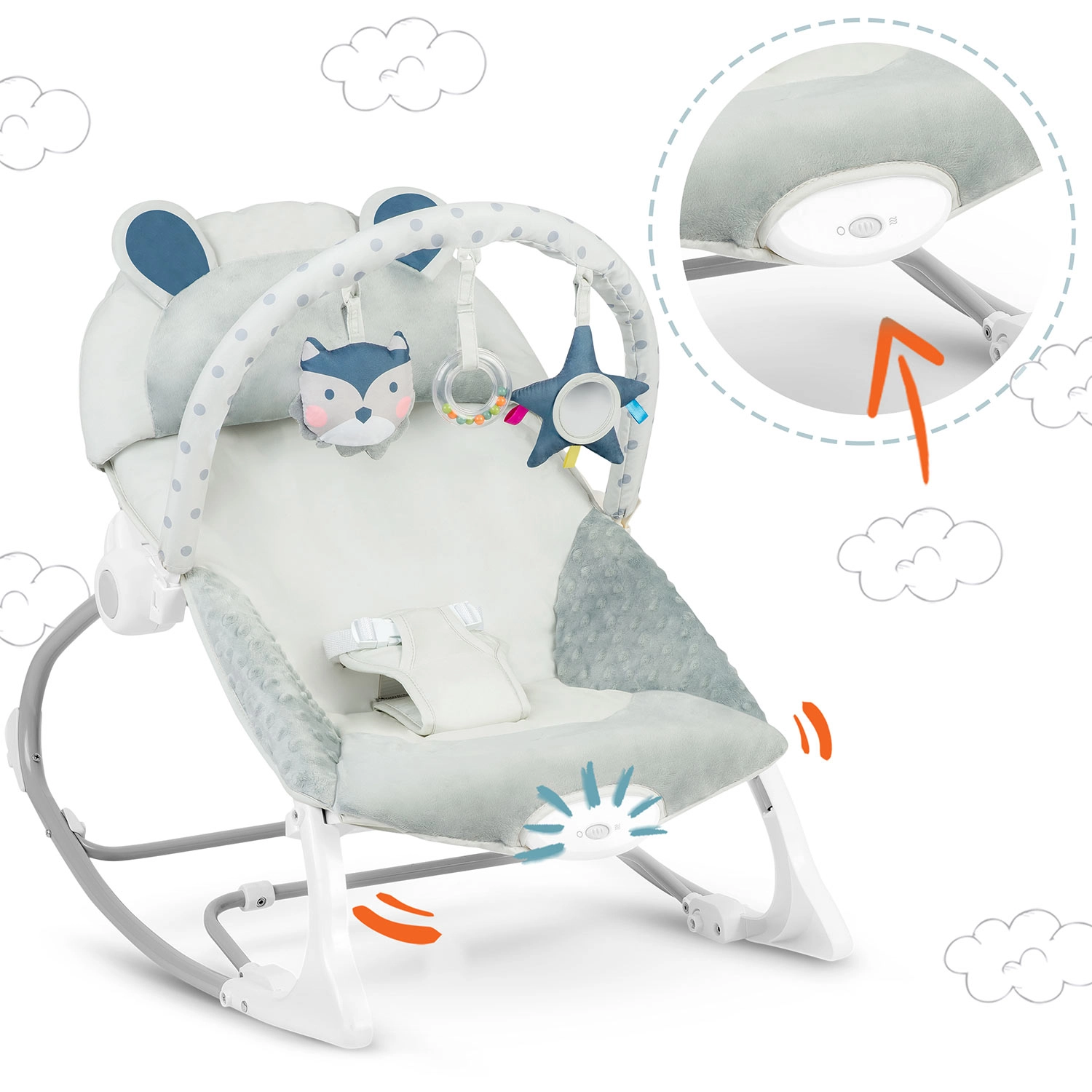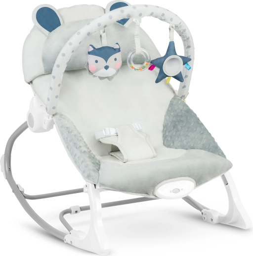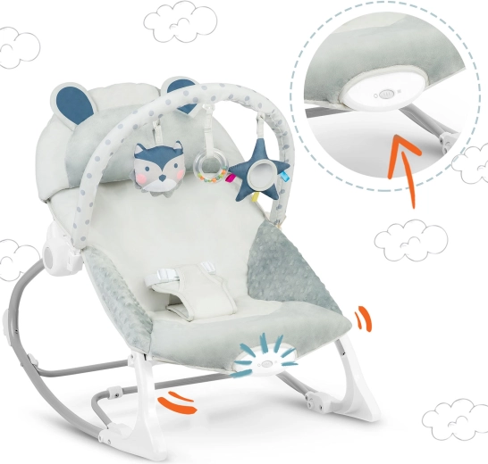 Șezlong-balansoar multifuncțional pentru copii RICOKIDS, în nuanță gri stilată, oferă vibrații liniștitoare, legănare delicată și bară de jucării detașabilă pentru divertisment și dezvoltarea simțurilor. Datorită husei moi, centurii în 3 puncte și picioarelor antiderapante, este confortabil și sigur. Husa se îndepărtează ușor și se poate spăla manual.