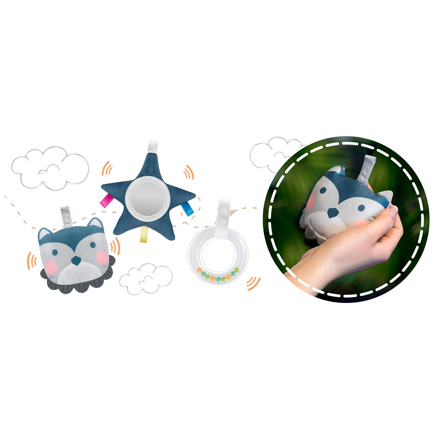 Bara detașabilă, cu jucării foșnitoare, inel și oglinjoară sigură, stimulează văzul, simțul tactil și coordonarea. Jucăriile pot fi ușor rearanjate sau înlocuite.