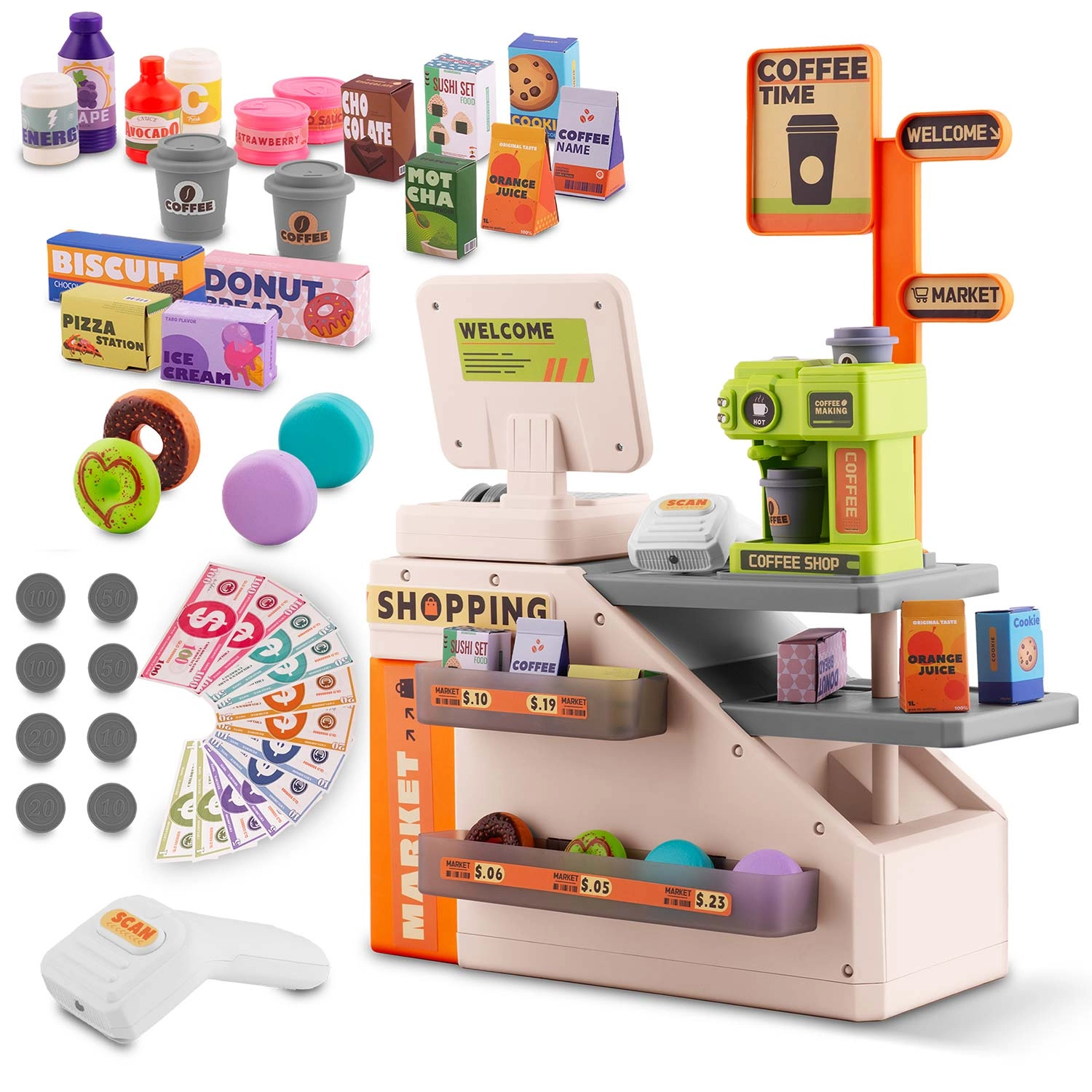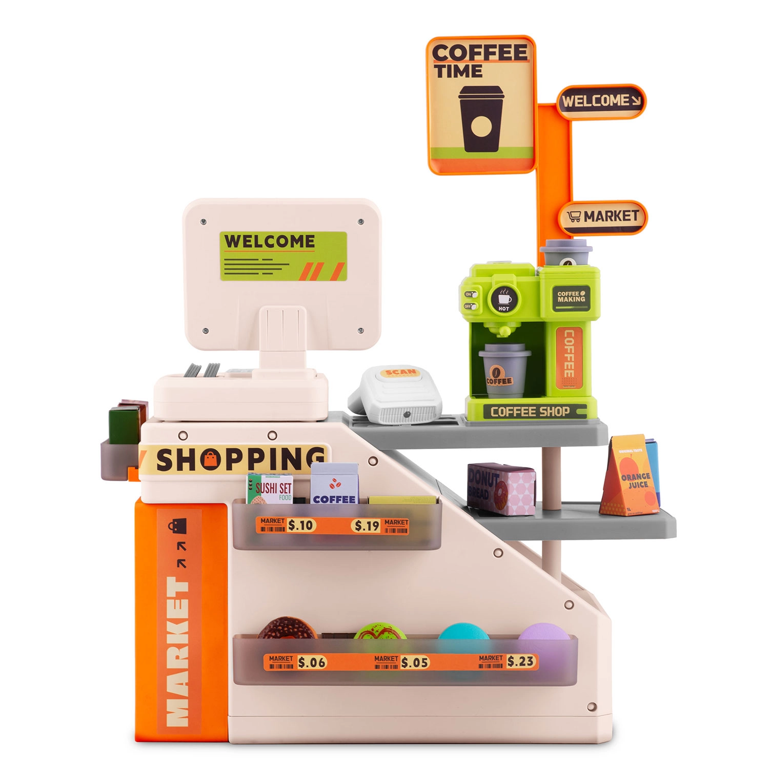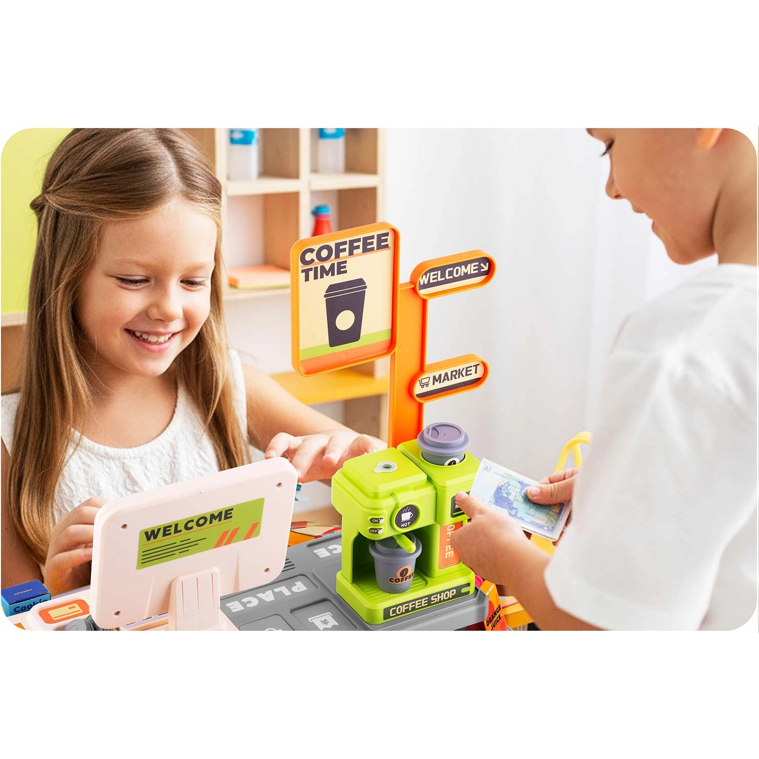 Această casă de marcat colorată și funcțională cu cafenea îi motivează pe copii să descopere roluri sociale și le dezvoltă imaginația. Datorită scannerului cu diodă roșie, butoanelor cu sunete și espressorului care poate fi umplut cu apă pentru o „cafea adevărată”, copiii se bucură de un joc realist de-a magazinul și barista.