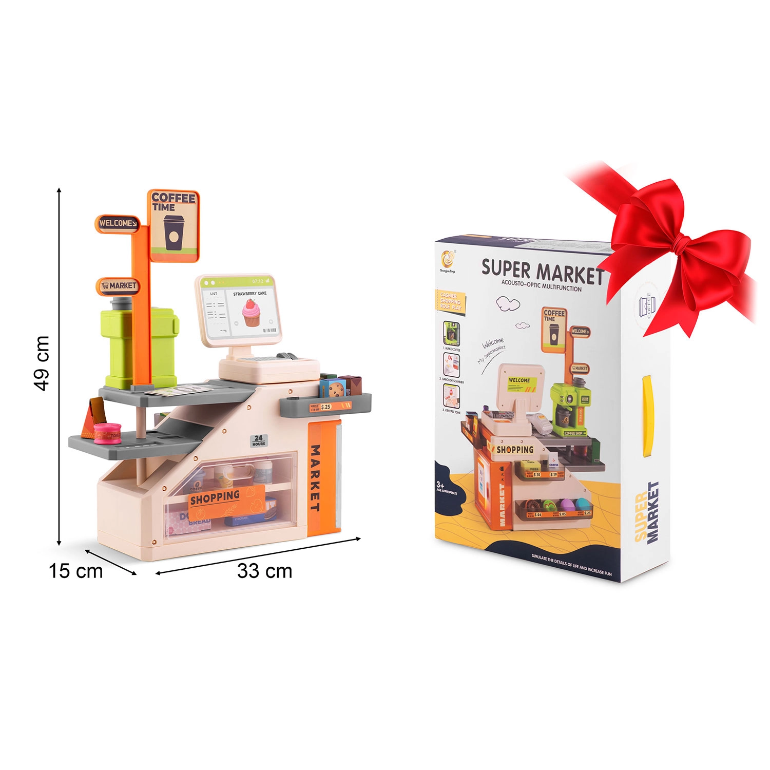 Setul include numeroase accesorii: bancnote de hârtie, monede din plastic, cutii cu alimente, biscuiți, conserve și sticle. Tejgheaua cu deschidere și compartimentele de depozitare ajută la menținerea ordinii, iar culorile vii și afișajul casei atrag atenția și susțin învățarea prin joc.
