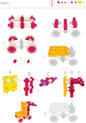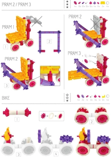 Setul de construcție KORBO EDU Pastel aduce 370 de piese din plastic de calitate, în culori delicate, care se fixează ușor și rămân stabile în timpul jocului. Datorită bazelor interconectabile, roților dințate și anvelopelor, copiii creează construcții dinamice – de la carusele și leagăne până la vehicule rulante. Rotiți o roată și urmăriți cum se pune în mișcare întregul mecanism.