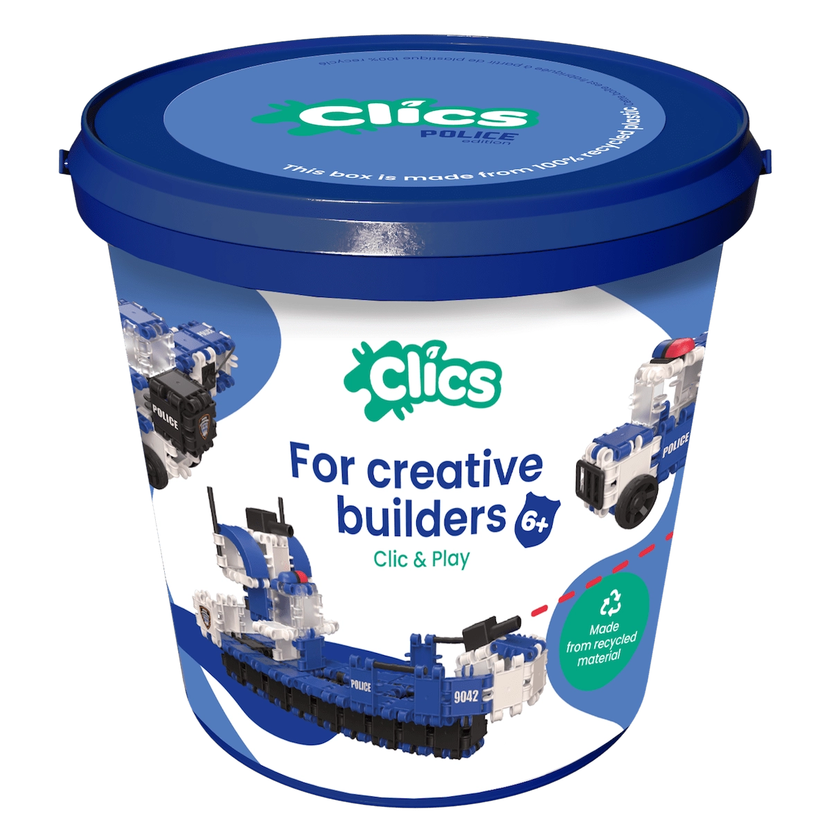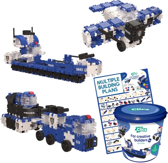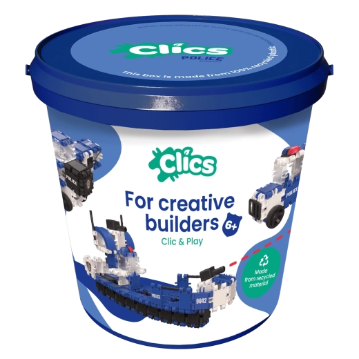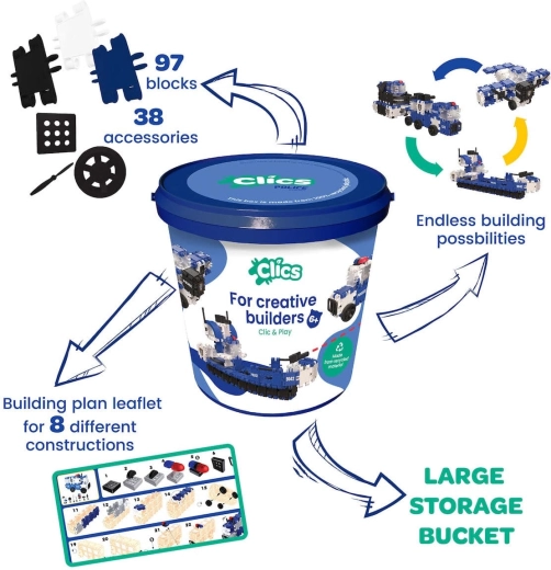 Setul de construcție Clics 8 în 1 este o soluție inteligentă pentru joacă creativă și depozitare ușoară. În găleată găsiți 155 de piese colorate, autocolante și instrucțiuni clare pentru 8 modele – de la vehicule și animale până la construcții simple. Piesele de aproximativ 5 × 5 cm se țin confortabil chiar și de mâini mici, iar datorită sistemului de prindere ferm, rămân sigur laolaltă în timpul jocului.