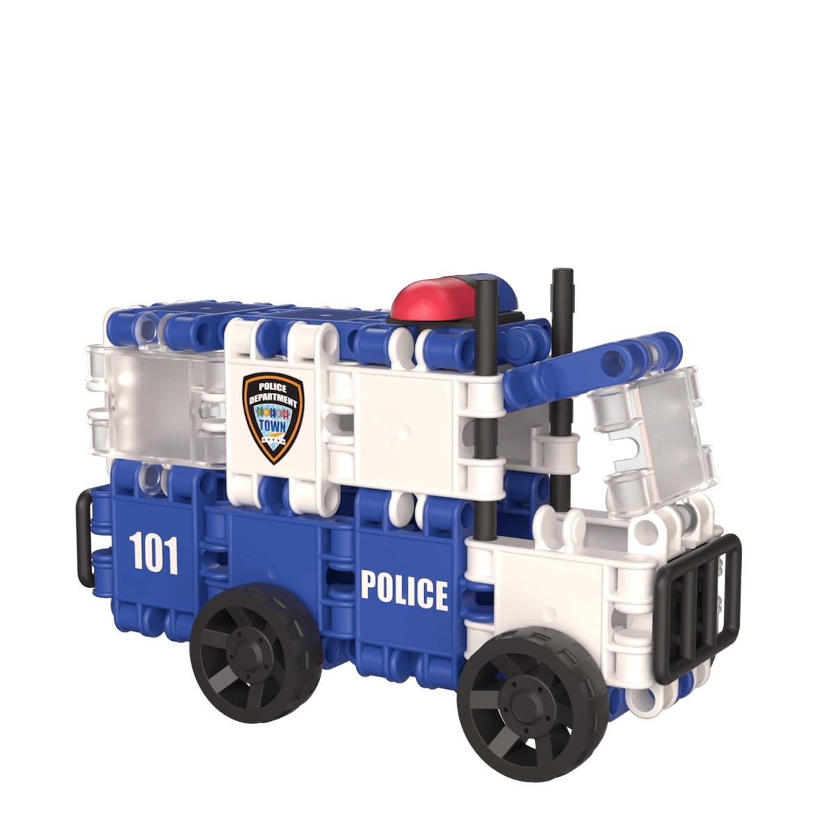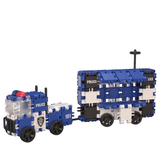 Construiți o mașină de poliție mobilă cu detalii, ferestre și lumini. Roțile robuste invită la joacă dinamică și dezvoltă imaginația.