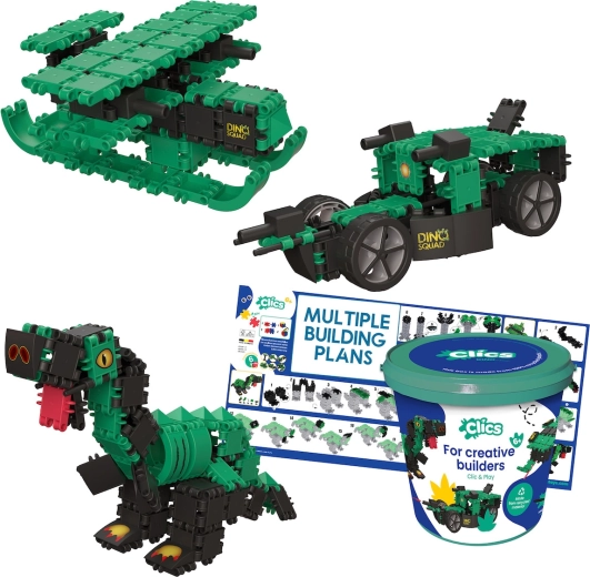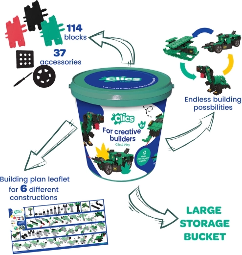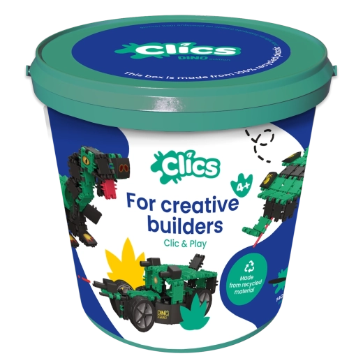 Găleata Clics Dinozauri oferă multă creație: din 141 de piese din plastic rezistent, în culori naturale, vei asambla pas cu pas 6 modele diferite de dinozauri după cardurile incluse. După ce le stăpânești pe toate, poți trece la propriile creații preistorice și să-ți dezvolți imaginația fără limite.